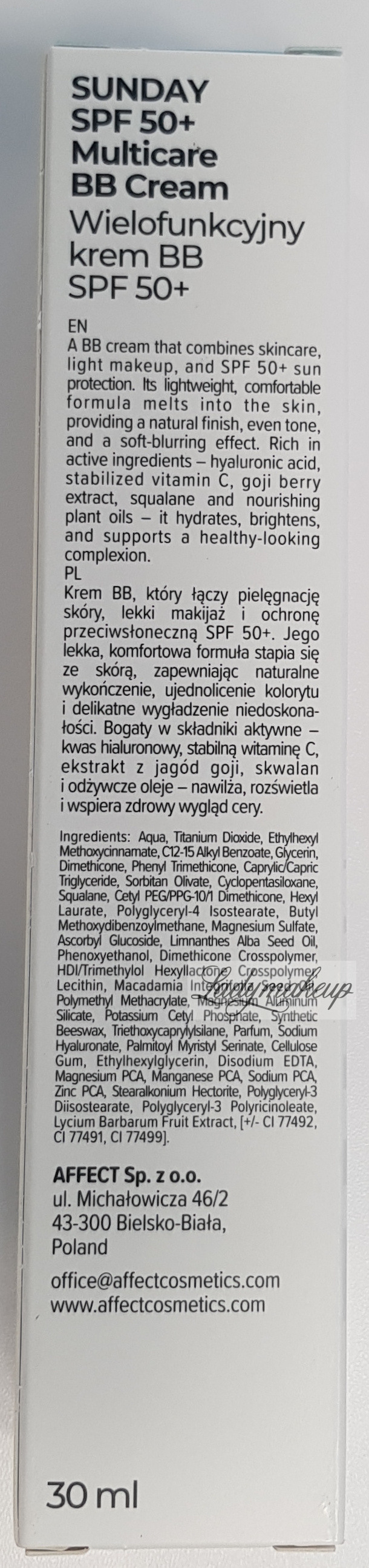 This BB cream is perfect for daily care of all skin types, especially combination, sensitive, and tired skin. It evens out skin tone, brightens the complexion, and gently conceals imperfections, leaving a natural, radiant finish. It also provides high sun protection (SPF 50+). It contains a complex of active ingredients including hyaluronic acid, stable vitamin C, goji berry extract, and natural oils (macadamia, meadowfoam) that intensely moisturize, nourish, and support epidermal regeneration. Thanks to its mineral pigments and soft-focus technology, Affect BB Cream smoothes pores and fine lines. It can be used alone or as a light makeup base. The product is available in 30 ml.