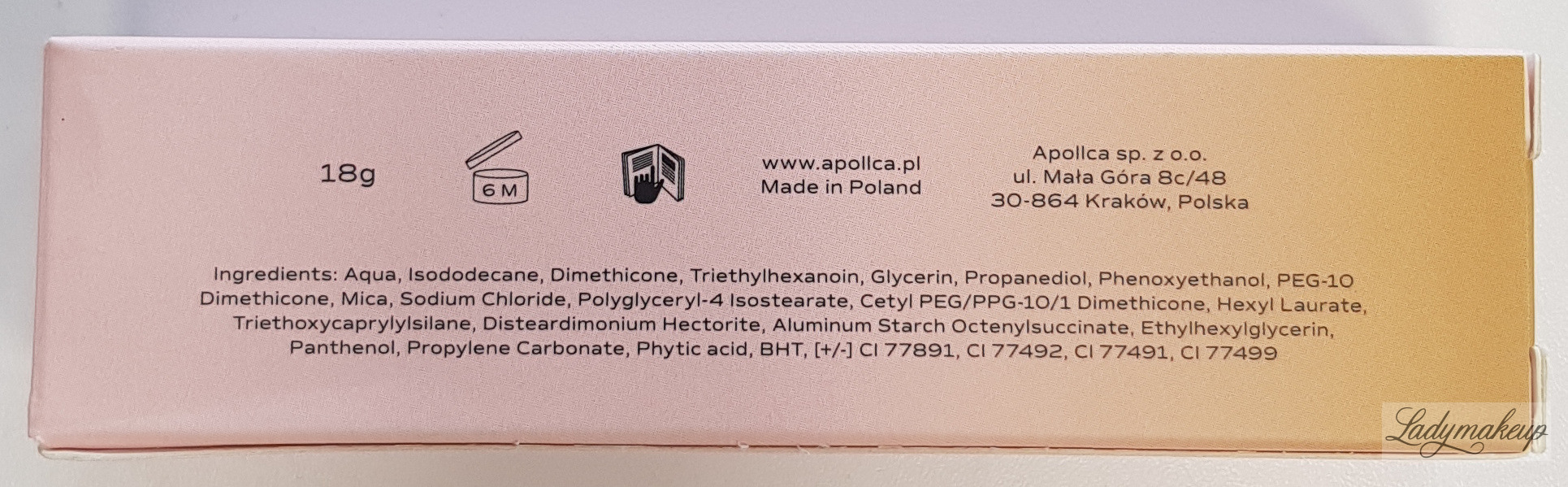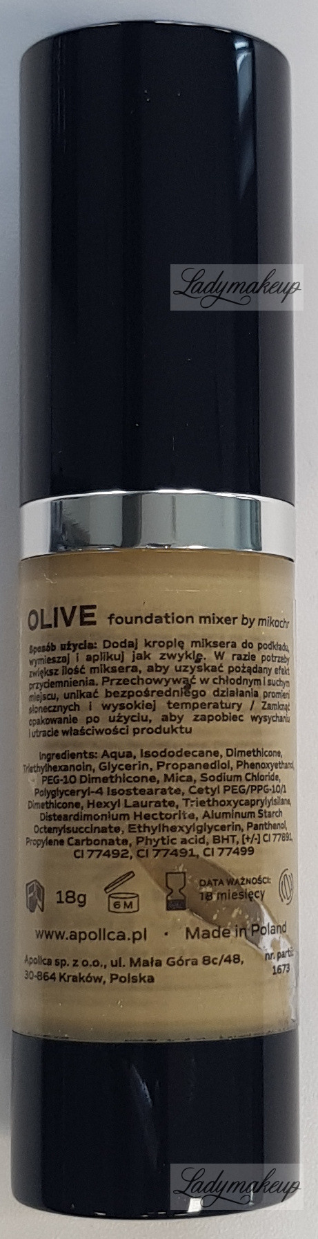 A mixer for foundation and concealer. Designed for mixing with foundation. Perfect for situations where you've purchased a foundation that's too dark, or when your previous foundation no longer suits you. It's also a lifesaver when you've simply never been able to find the perfect foundation shade for your skin tone. Why bother? Create it yourself! The Apollca mixer has a delicate, creamy formula that blends well with foundations of various textures without altering their active properties, longevity, or even consistency. The Olive version was created for complexions with olive or earthy undertones. The Apollca mixer effectively neutralizes foundations that are too pink or yellow. The product is available in an 18g container.