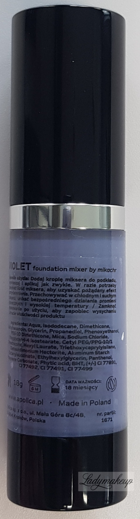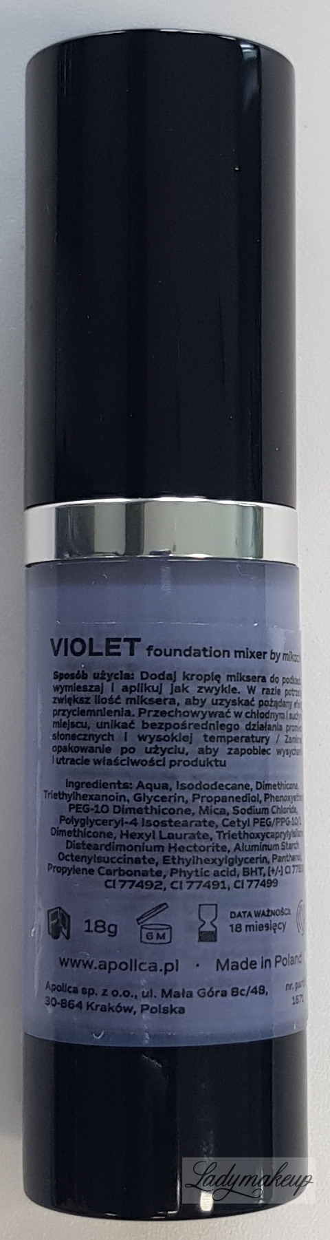 A foundation mixer. Designed for mixing with foundation. Perfect for situations where you've purchased a foundation that's too dark, or when your previous foundation no longer suits you. It's also a lifesaver when you've simply never been able to find the perfect foundation shade for your complexion. Why bother? Create it yourself! The Apollca mixer has a delicate, creamy formula that blends well with foundations of various textures without altering their active properties, longevity, or even consistency. The Violet version has a purple-gray tint that tones and cools foundations that are too warm (yellow, orange, or olive), while also providing a more beige, neutral tone. The product is available in an 18g bottle.