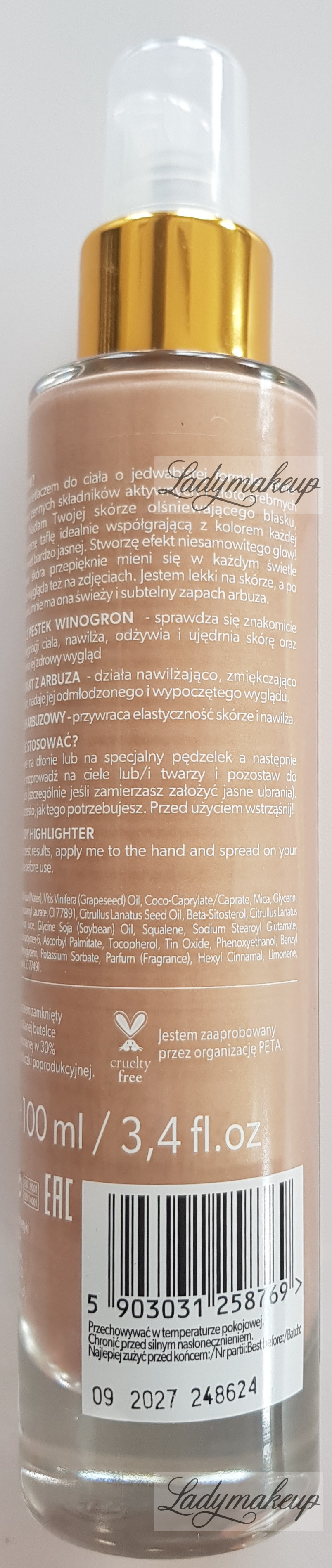 This body highlighter is 100% vegan and consists of 97% natural ingredients, including grape seed oil, watermelon extract, and watermelon oil. It's enriched with special gold-silver particles that beautifully illuminate the skin, enhance the tan, and shimmer in the sun. The cosmetic perfectly moisturizes, nourishes, softens, and restores skin's elasticity and firmness. Thanks to its special formula, it adapts to every complexion and skin tone, giving it a beautifully sun-kissed and radiant look. The cosmetic is available in a 100 ml glass bottle.