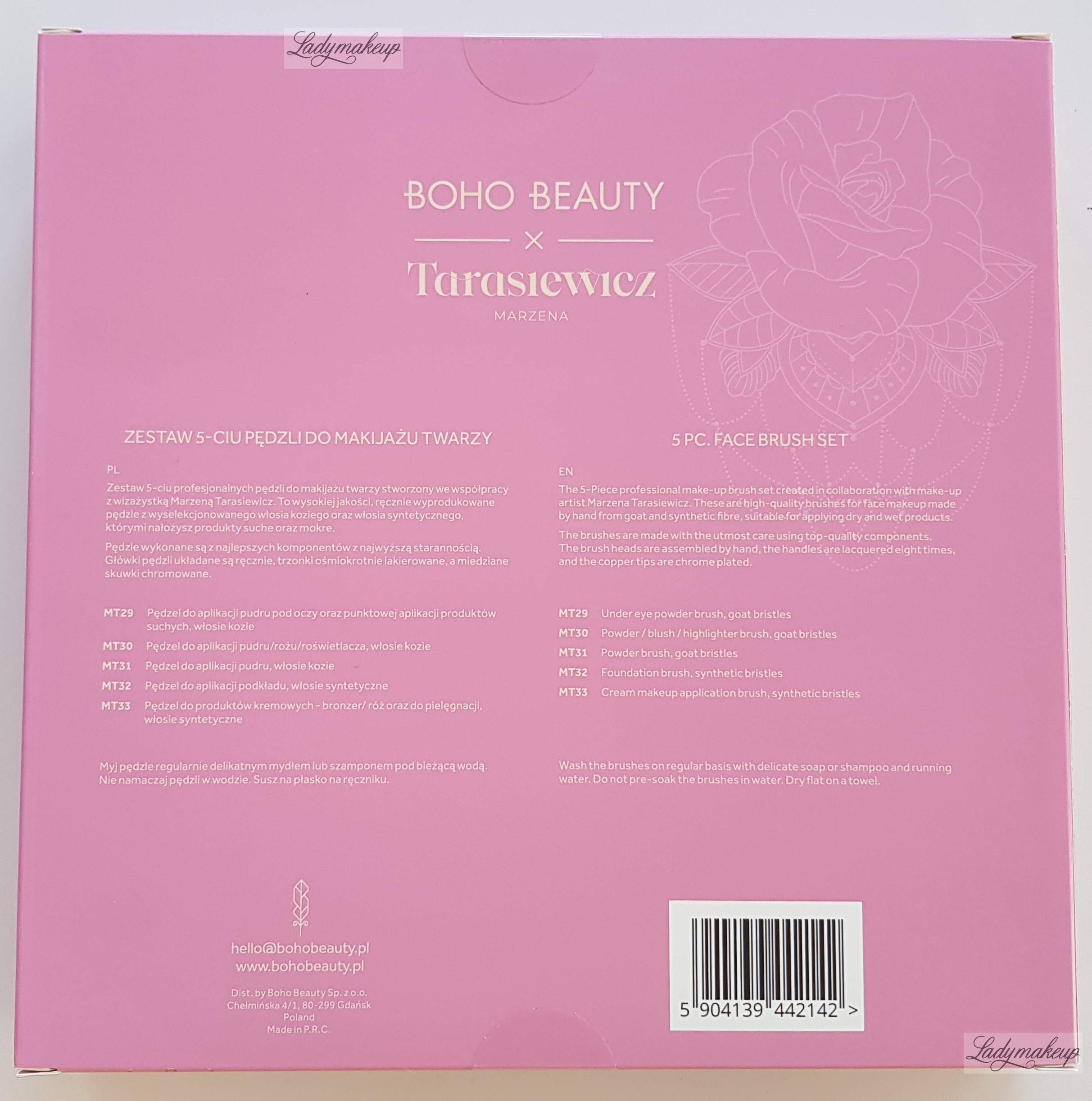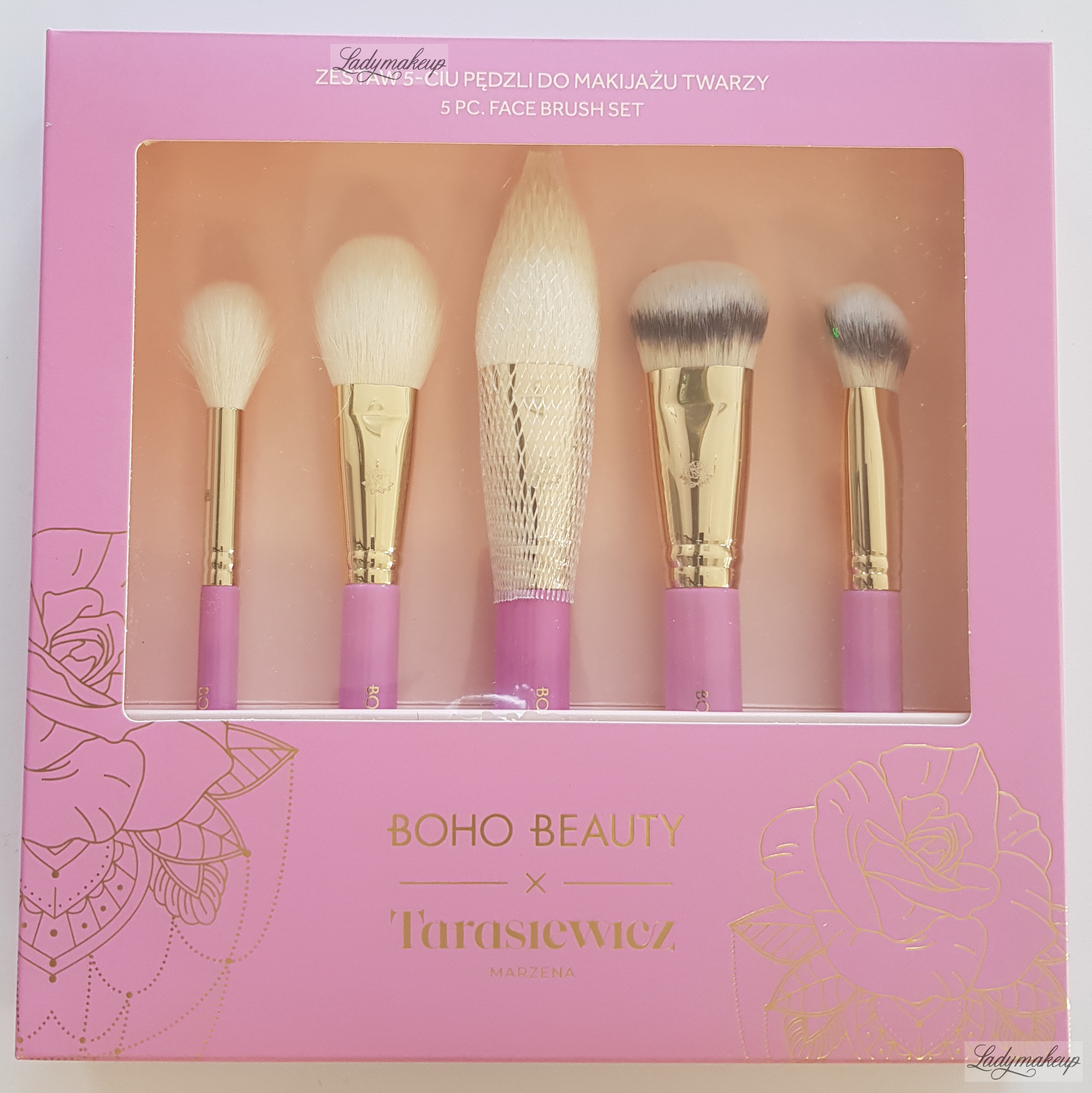 is a set of brushes for face makeup. This special series was created in collaboration with renowned makeup artist Marzena Tarasiewicz. It allows for the efficient and hassle-free application of any facial makeup look. Makeup created with these brushes will look flawless and seductive. Depending on the model, the brushes are made of natural goat hair or synthetic bristles. This is an excellent set of makeup brushes for both professionals and amateurs, as it contains all the essential brushes for the face. The Boho Beauty set is packaged in elegant, stylish packaging in shades of light pink and purple, making it an ideal gift for yourself or a loved one.