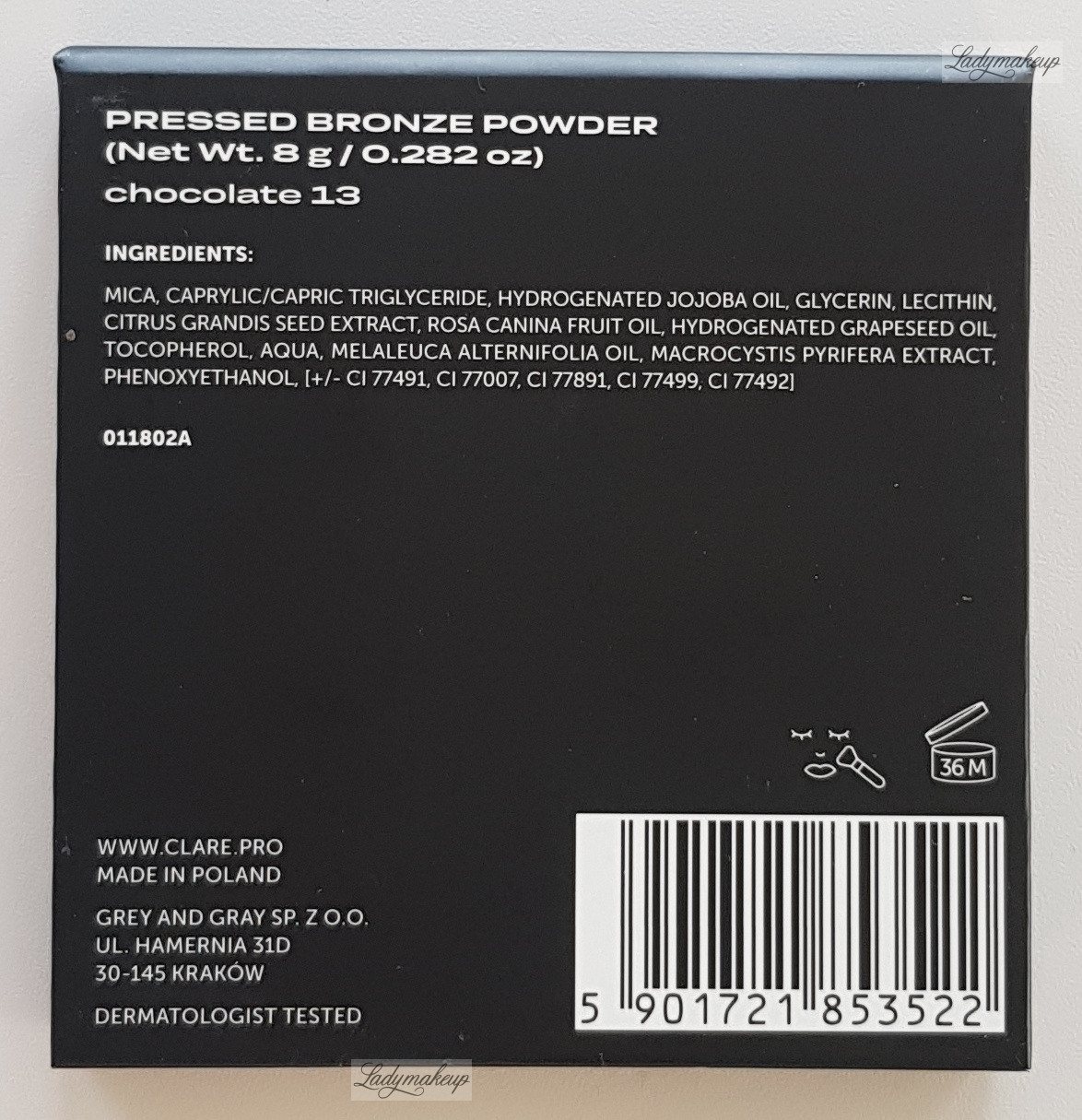 Pressed bronzer. Created in collaboration with Doctor MakeUp, Marta Iwańska – a renowned and respected makeup artist, and trainer. Its pressed formula boasts exceptional pigmentation and saturation. It easily allows for building and building coverage to your liking, without fear of fallout, streaking, or patchiness. It's perfect for sculpting the face, classic contouring, and adding warmth to the face and body. The product spreads effortlessly on the skin and blends beautifully with the epidermis and any layer of makeup. ClarÉ Bronzer is available in a sturdy 8g cardboard container.