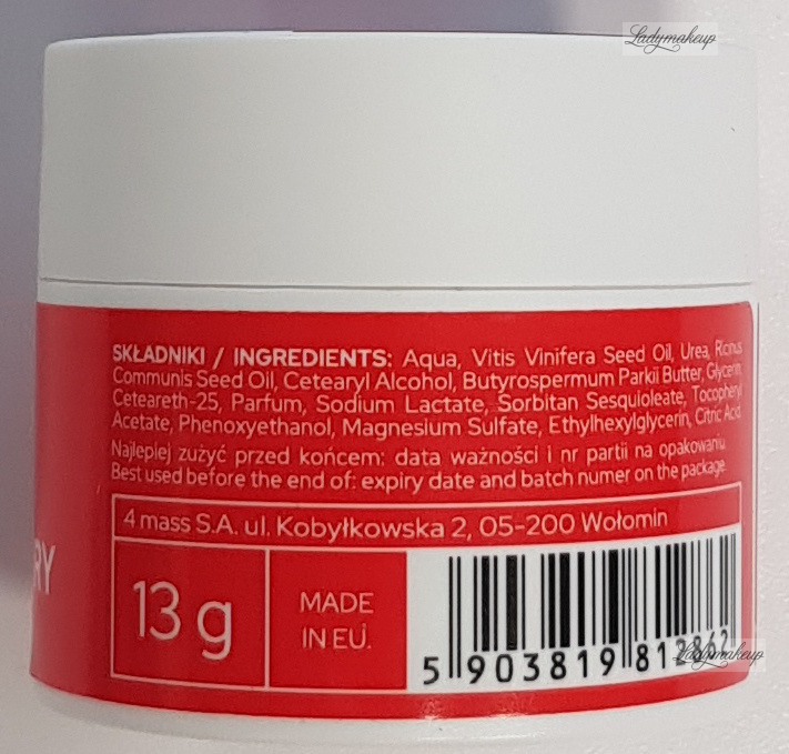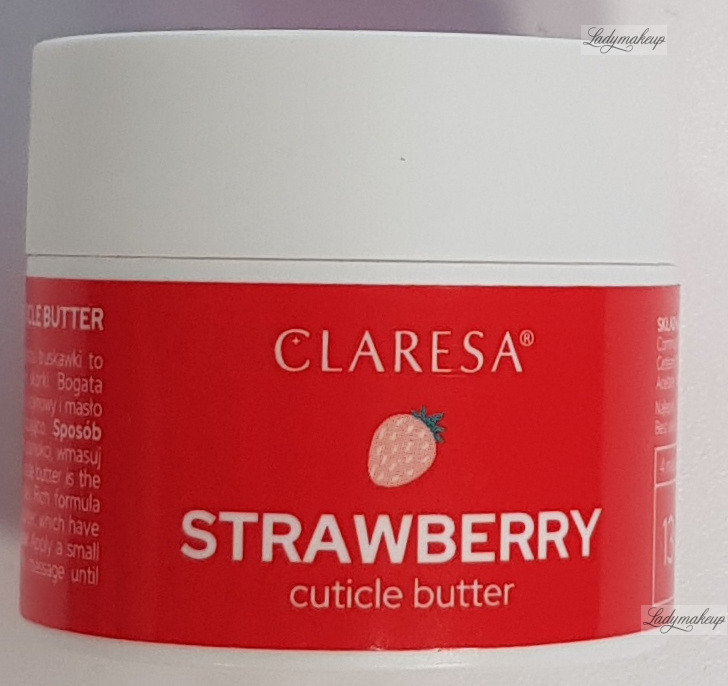 Cuticle butter. Created specifically for regular care of the skin around the nails, it has a pleasantly creamy butter formula that is pleasant to apply and absorbs well into the skin. Enriched with specially selected active ingredients, including grape seed oil, castor oil, and shea butter, Claresa cuticle butter intensely moisturizes, nourishes, and smooths the skin. After use, the delicate skin around the nails is well-nourished and softened, while nails are strengthened and beautifully shiny. Claresa cuticle butter has a sweet, strawberry aroma. The product is available in a 13g bottle.