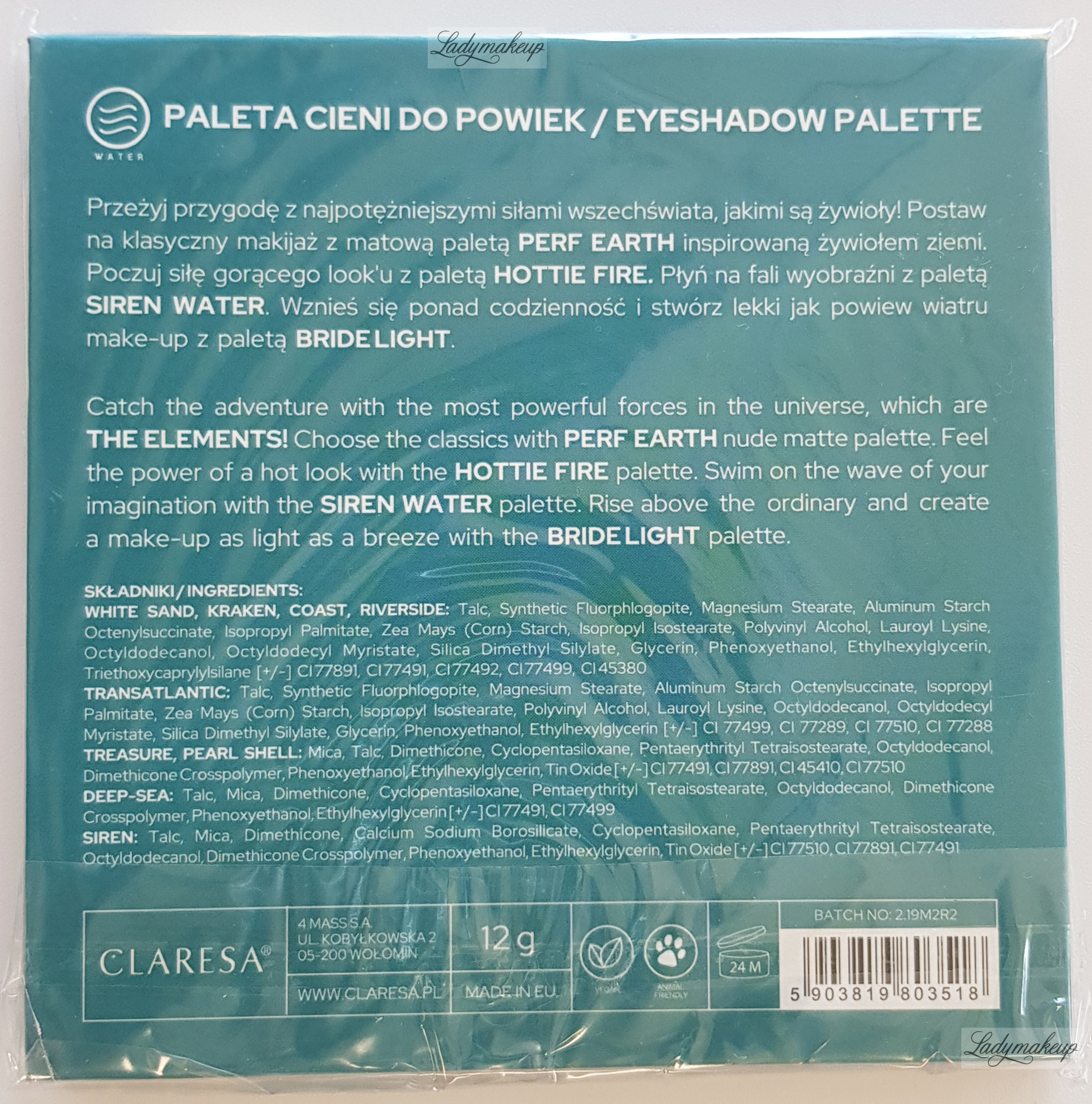 This eyeshadow palette consists of nine pressed powders with different finishes (matte and pearl). The harmoniously selected color palette evokes the element of water. The diverse shades make it perfect for both everyday use and more formal occasions. The shadows have a pleasantly silky formula that blends smoothly and easily with other shades, creating very natural transitions. The highly saturated shades do not fall out during application and do not fade with wear. The cosmetic is available in a sturdy cardboard palette.