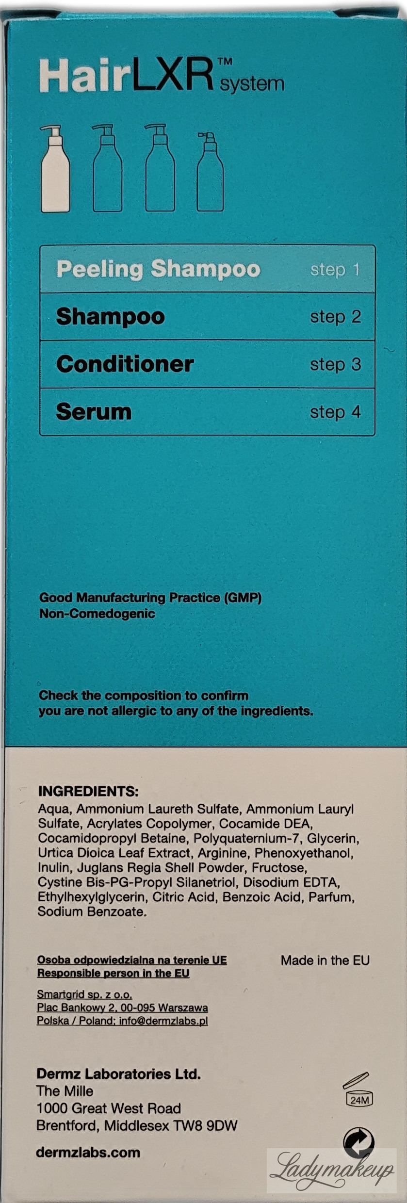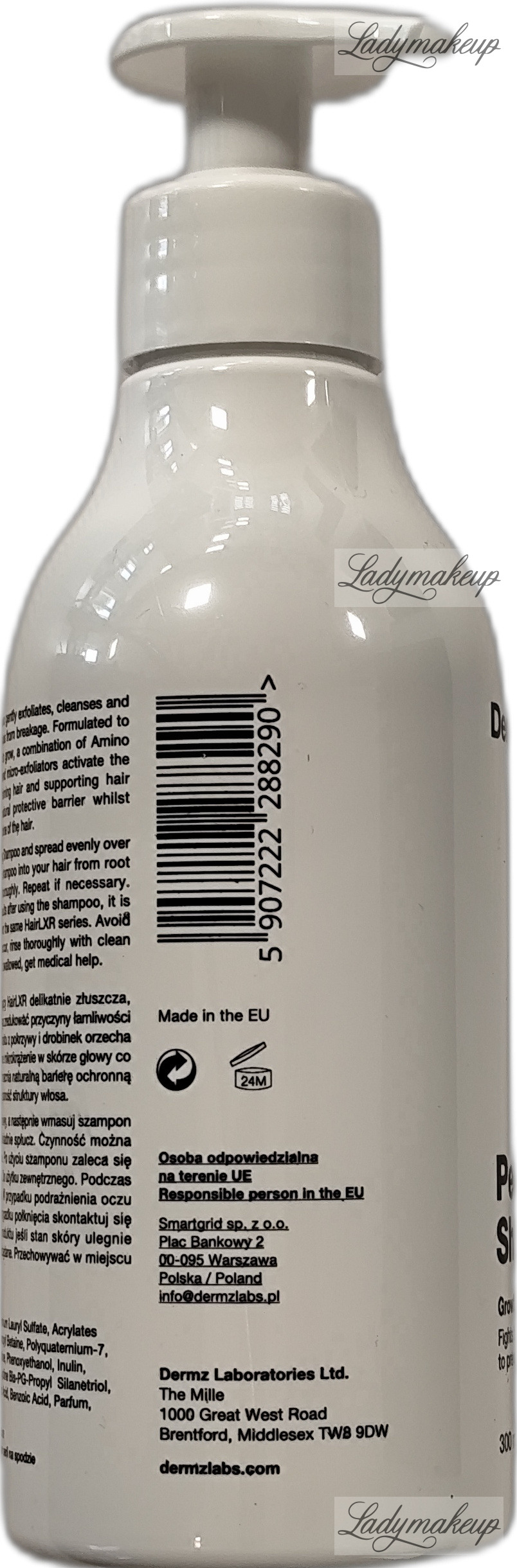 A hair shampoo designed for all hair types. Its formula contains active ingredients such as amino acids, nettle extract, and walnut particles. Dermz shampoo gently exfoliates and thoroughly cleanses the skin of all impurities and excess sebum. It effectively stimulates hair follicles and roots to grow healthier and thicker hair. It also soothes irritations, deeply moisturizes, and regenerates the hair cuticle. Regular use restores balance to the scalp. The product is available in a 300 ml bottle with a convenient pump that dispenses the right amount of product.