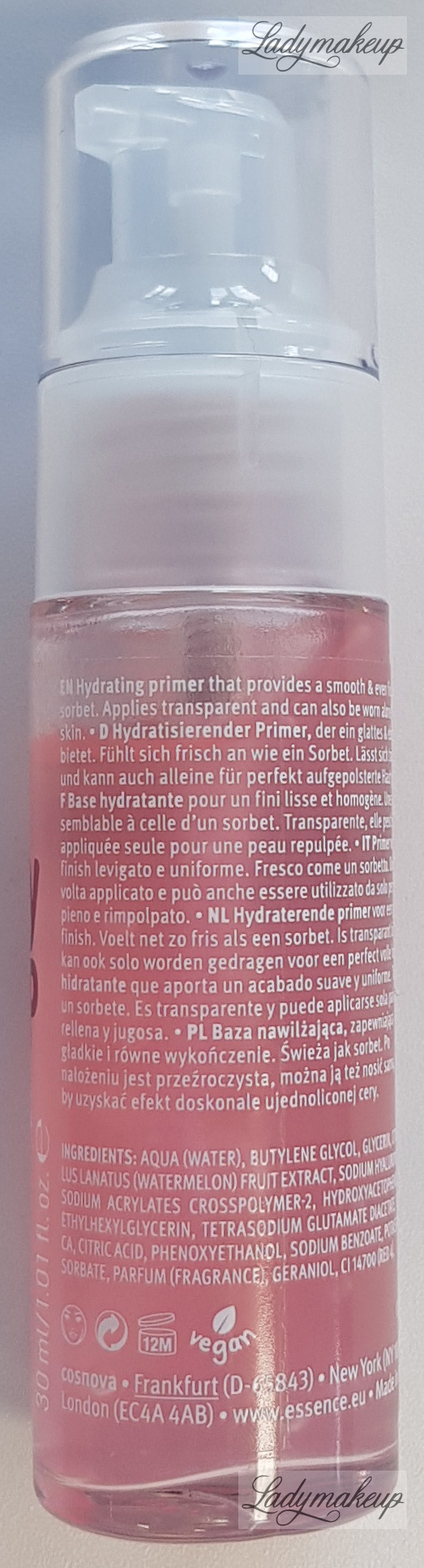 A makeup primer for all skin types. 100% vegan. Its gel formula resembles a sorbet in consistency. The Essence primer effectively prepares the skin before applying makeup. It pleasantly cools, deeply moisturizes, soothes irritations, and smooths the epidermis. Regular use of the Essence primer makes the skin more supple and gives it a radiant glow. The product has a tempting watermelon color and the same pleasant watermelon scent. It comes in a 30 ml bottle with a pump that dispenses the right amount of product. Its formula is free from parabens, gluten, alcohol, and oil.