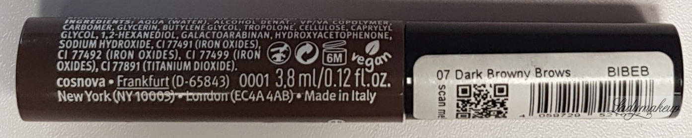 Eyebrow mascara. Perfectly shapes the unruly hair, giving them color. Thanks to a small, comfortable brush, the application very easy. Fine fibers fill all gaps. The eyebrows become more dense and expressive. Provides a natural make-up finish. The product is available in a few shades. Perfect for use in professional saloons as well as in the comfort of home.