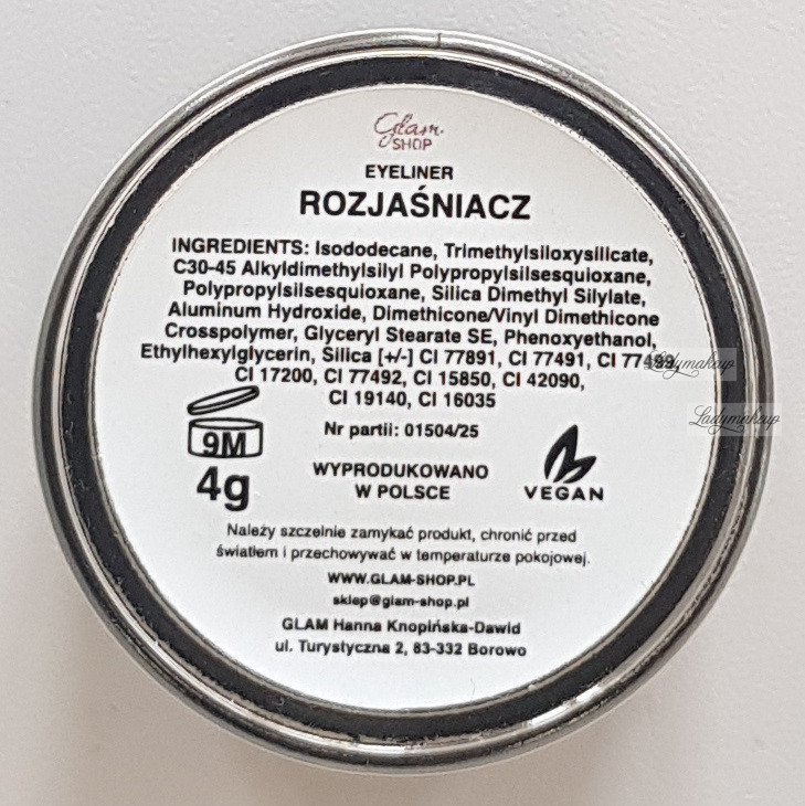 It has a pleasantly creamy formula that applies softly and smoothly to the skin. Thanks to its excellent pigmentation, just a small amount of the product is enough to achieve tempting effects. Glam Shop Eyeliner allows you to draw a precise line on the eyelid, thus defining and finishing eye makeup. It perfectly highlights and intensifies the eyes, and in a lighter shade, it optically enlarges and opens the eyes. The pleasantly creamy formula allows Glam Shop Eyeliner to be used in a variety of ways, such as as an eyeshadow substitute or for body art. The cosmetic is available in a 4g glass jar.