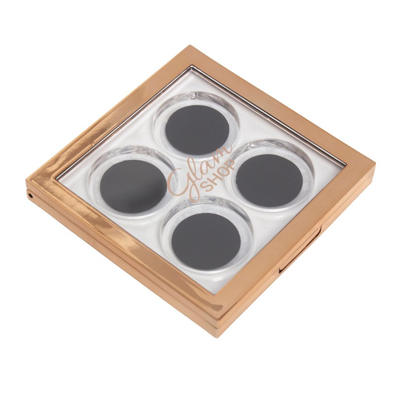 has four empty compartments for eyeshadows. The Glam Shop palette will help you organize your individual pressed powders (eyeshadows) and ensure their efficient and safe transport while traveling. It allows you to create your own unique and completely personalized palette. This way, you no longer have to compromise and buy several different palettes, some of which you'll never use. Additionally, the Glam Shop case has a transparent lid, allowing you to immediately see which shadows are inside. The palette boasts an elegant and minimalist design.