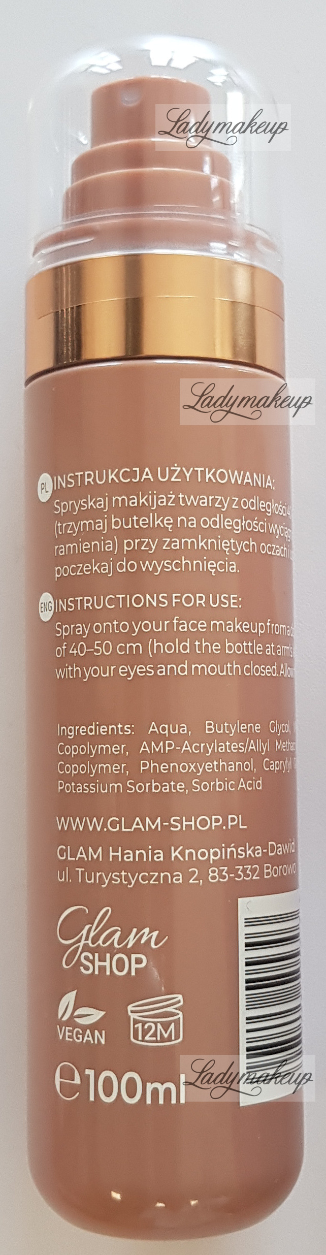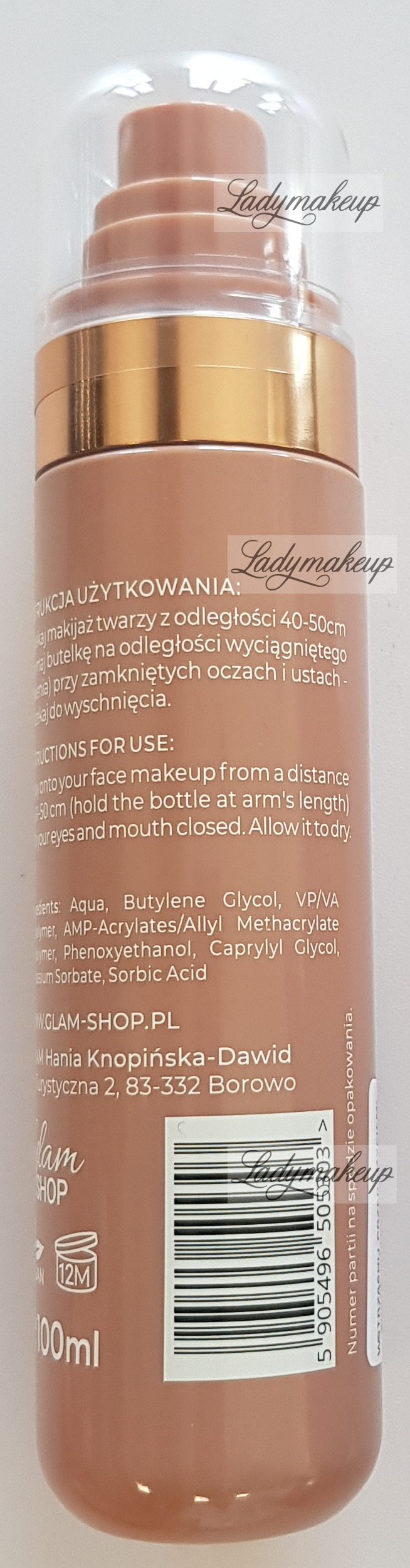 A facial mist. It quickly and easily extends the wear of your entire makeup. Its liquid formula transforms into a pleasant mist with a special applicator that doesn't streak the skin. Glam Shop's setting mist leaves a subtle, matte finish on the skin, guaranteeing a flawless makeup effect for hours after application. The product dries very quickly, allowing you to enjoy spectacular makeup in no time. The product is available in a 100 ml bottle.