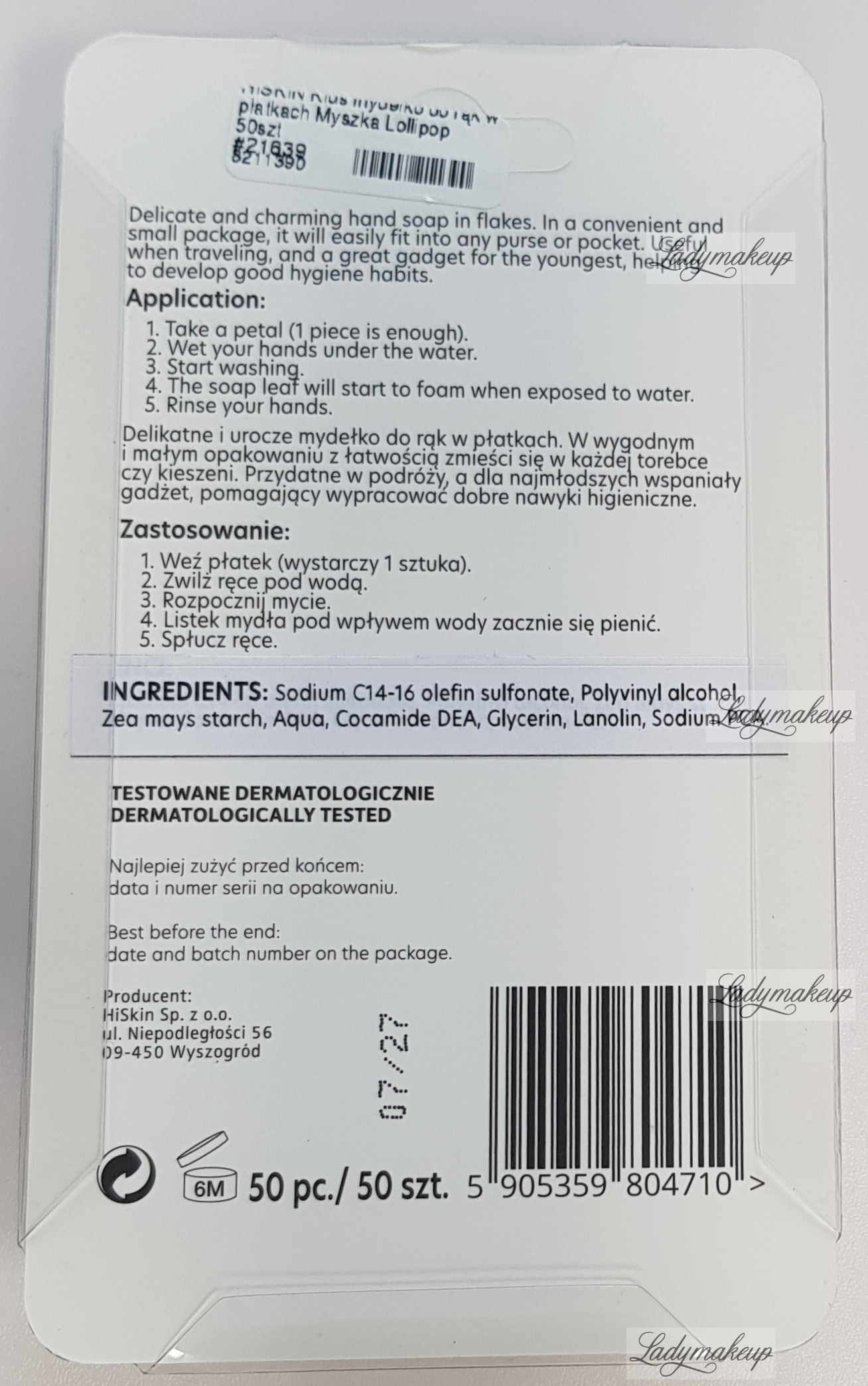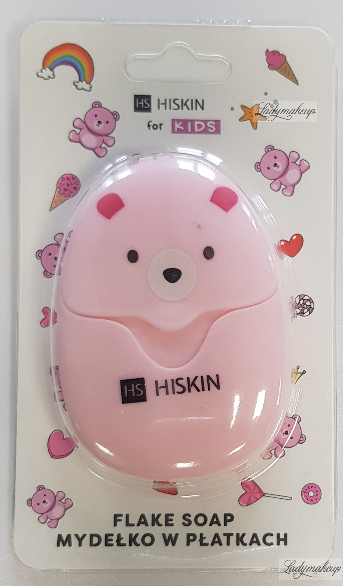 This soap flake is a fantastic solution for travel and outdoors (e.g., on a walk) for moms of toddlers and older children. It helps keep hands (and not only) of children and adults in pristine condition. The soap comes in a convenient form of small flakes, which simply need to be rubbed between your hands under running water to create a delicate, creamy lather. Hiskin soap thoroughly cleanses the skin of all dirt and impurities without causing irritation. Furthermore, Hiskin soap has a tempting, delicate candy scent. The special flattened packaging makes it perfect for any handbag or child's backpack, while the charming animal shape encourages children to use them. The package contains 50 flakes.