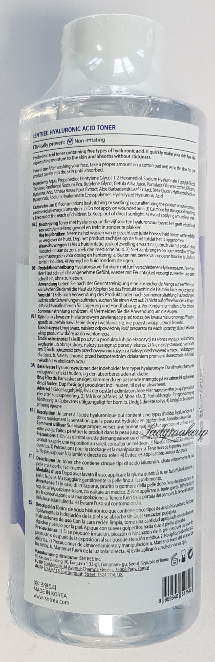 A facial toner. Designed for all skin types, especially dry and irritated skin. It pleasantly refreshes, tones, and restores the skin's natural pH. Contains highly concentrated active ingredients: hyaluronic acid, trehalose, aloe and birch leaf extract, and beta-glucan. It effectively moisturizes, soothes, and calms irritations, while improving the elasticity and firmness of the epidermis. It effectively binds water in the epidermis and prevents water loss. The product is available in a 400 ml bottle.