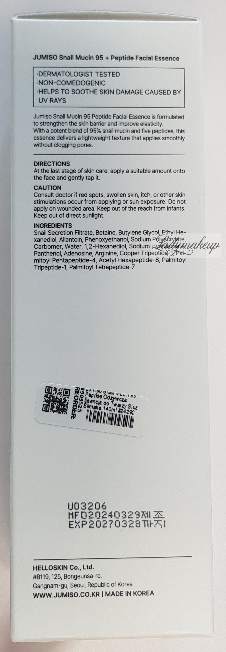 A facial essence. It makes daily facial care quick and incredibly pleasant. It is ideal for all skin types, especially irritated skin and skin with a compromised protective barrier. Its formula contains specially selected active ingredients, including 95% snail secretion filtrate, a 5-peptide complex, allantoin, and panthenol. Jumiso essence provides long-lasting hydration, softens, and smooths the skin. It also effectively soothes and calms irritation and redness, stimulates epidermal regeneration, and rebuilds the skin's protective barrier. Furthermore, the cosmetic has anti-aging properties and supports acne treatment. Jumiso facial essence is available in a 140 ml bottle.