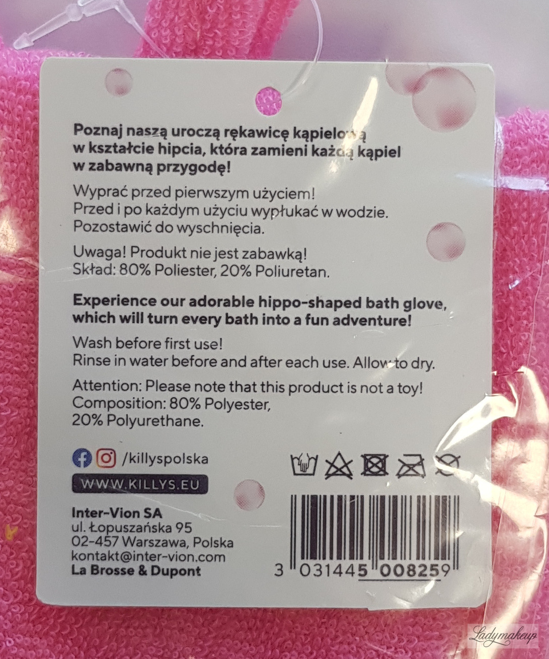 This bathing glove features a charming yet playful hippo shape, transforming every child's bath from a chore into a fun activity. The KillyS glove is made of a special absorbent material that allows for the foaming of cosmetics, such as shower gels, and their smooth and effortless application. Its special "puppet" shape allows you to place it on your hand and enjoy water play with your little one. The special thick material with added gel effectively cleanses the skin of all impurities and allows for a gentle massage. The package includes one hippo-shaped bathing glove.
