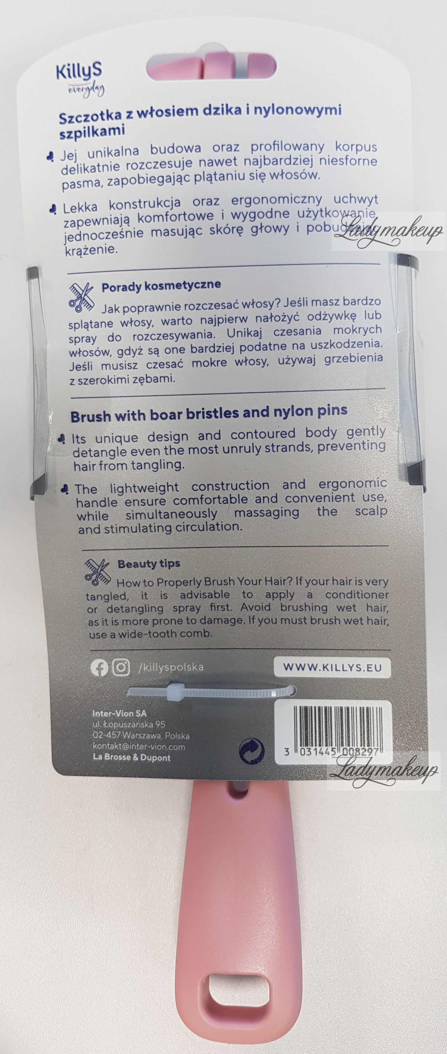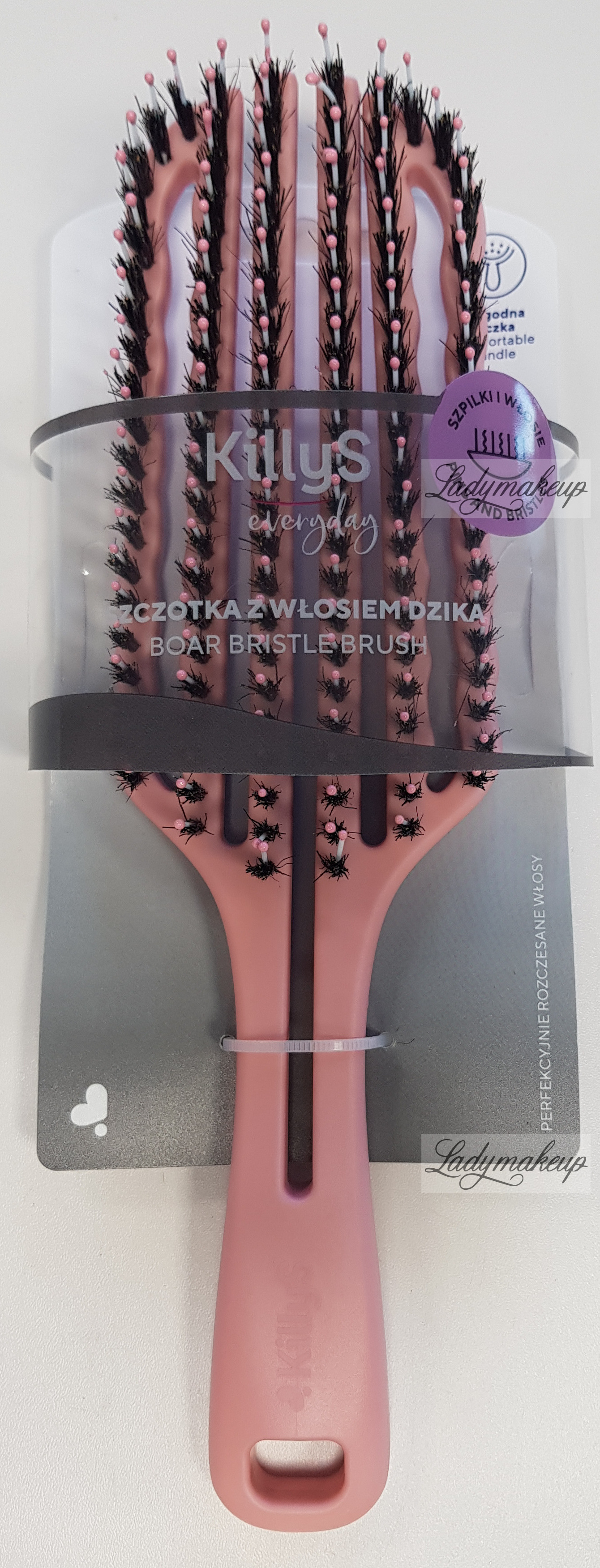 A hairbrush designed for daily care of all hair types and lengths. The KillyS brush features modern nylon needles tipped with special balls that gently massage the scalp with each brushing. Additionally, each needle features natural boar bristles, which gently detangle, add shine, and smooth hair. The KillyS brush is incredibly lightweight and has a flexible body that adapts to the shape of your head while brushing. It also has antistatic properties, preventing frizz and static. The brush is available in a charming pink color.