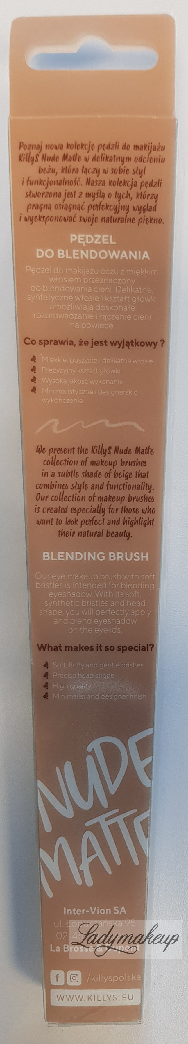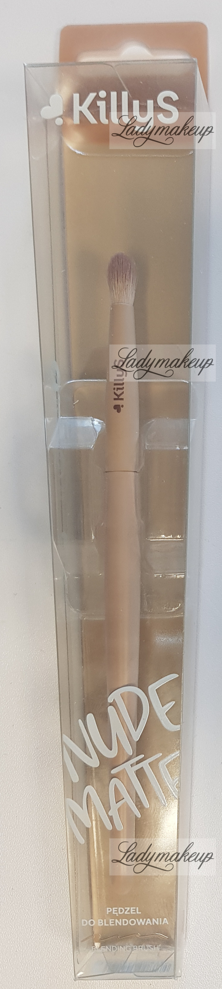 is a 100% vegan face makeup brush from the special Nude Matte series, featuring a nude-beige handle and a matte-finish ferrule. Featuring a small head with a slightly rounded tip, the KillyS brush is perfect for applying eyeshadow and blending its edges. It's made of incredibly soft, two-toned synthetic bristles that won't irritate or scratch even the most sensitive skin. The brush is mounted on a well-shaped wooden handle, boasting a minimalist, designer look.