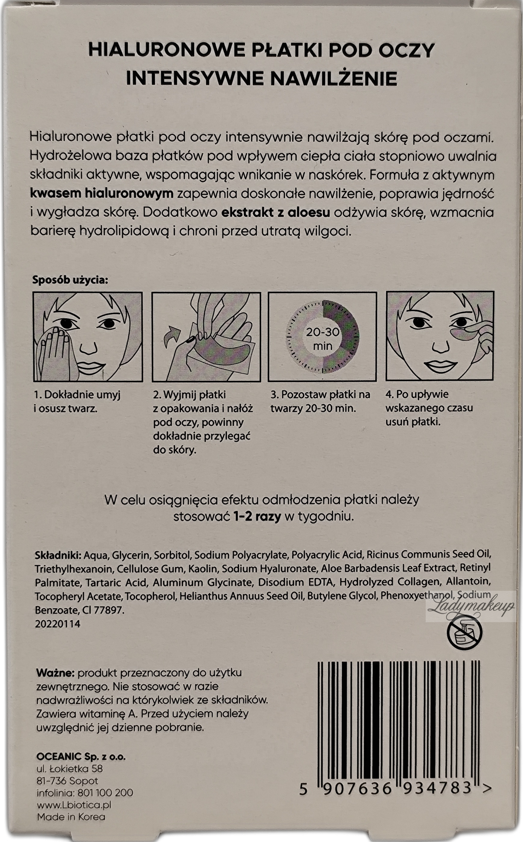 They have a hydrogel form filled to the brim with beneficial ingredients, such as hyaluronic acid, castor oil and aloe. Combined with the heat of the human body, they gradually release active ingredients and allow them to penetrate more efficiently into the epidermis. They intensively moisturize, deeply nourish and improve the skin's tension and elasticity. Additionally, it helps reduce swelling and all other signs of fatigue. The set includes three pairs of petals, i.e. 3 x 2 pieces.
