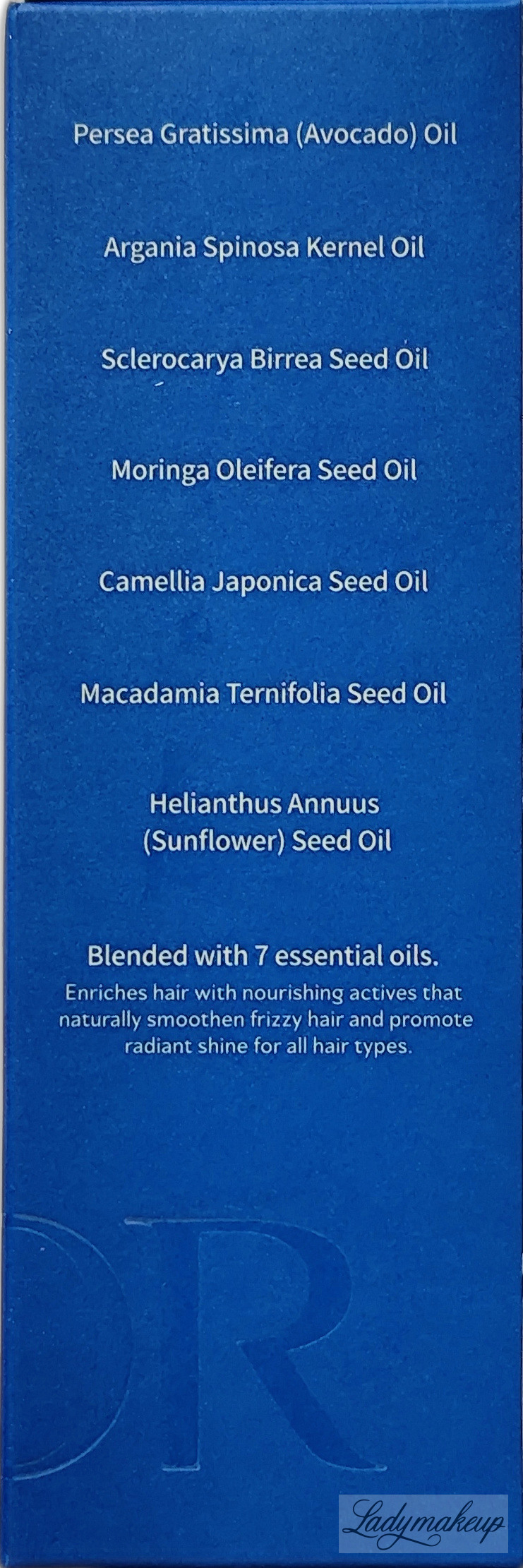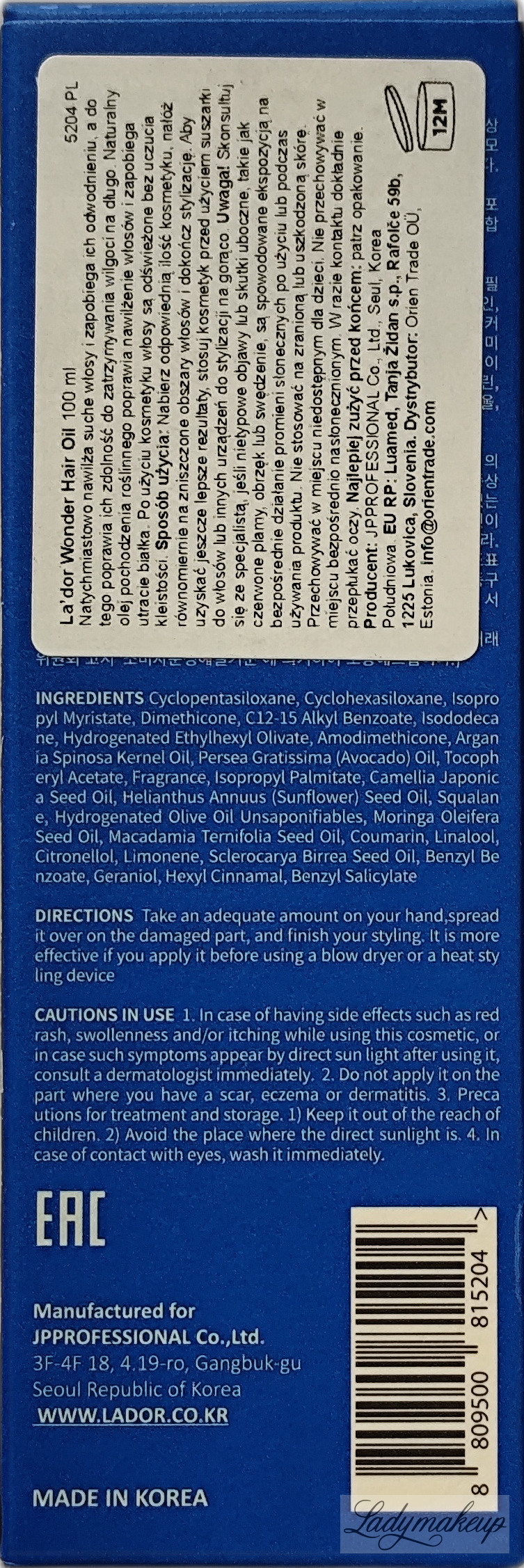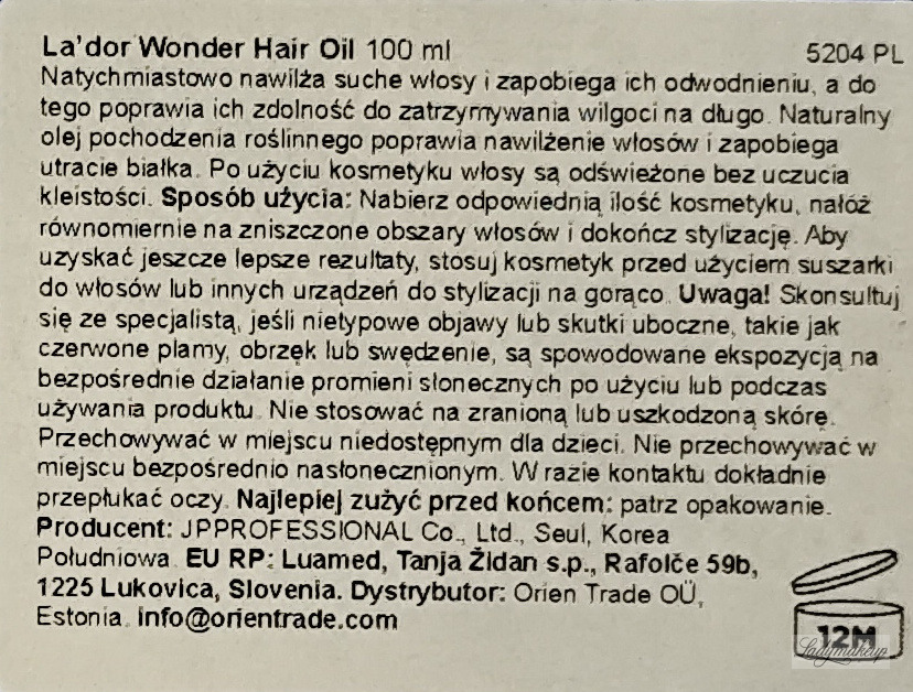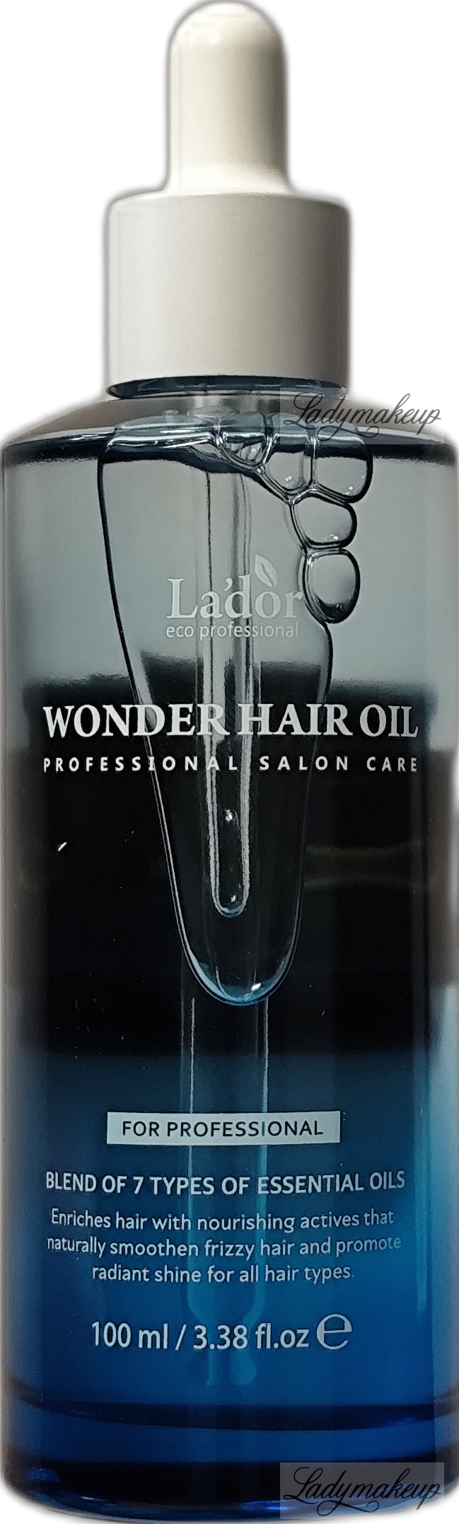 A hair oil designed for the care of dry and dehydrated hair. Its effectiveness is based on a special blend of seven beneficial oils, including avocado, argan, marula, moringa, Japanese camellia, macadamia, and sunflower seed, with added squalane and vitamin E. La'dor oil intensely moisturizes and dramatically smooths hair from root to tip. It also improves hair's ability to retain water, preventing dryness. This product effectively prevents split ends, restores a healthy and alluring shine, and softens hair. La'dor oil is packaged in a sturdy glass bottle.
