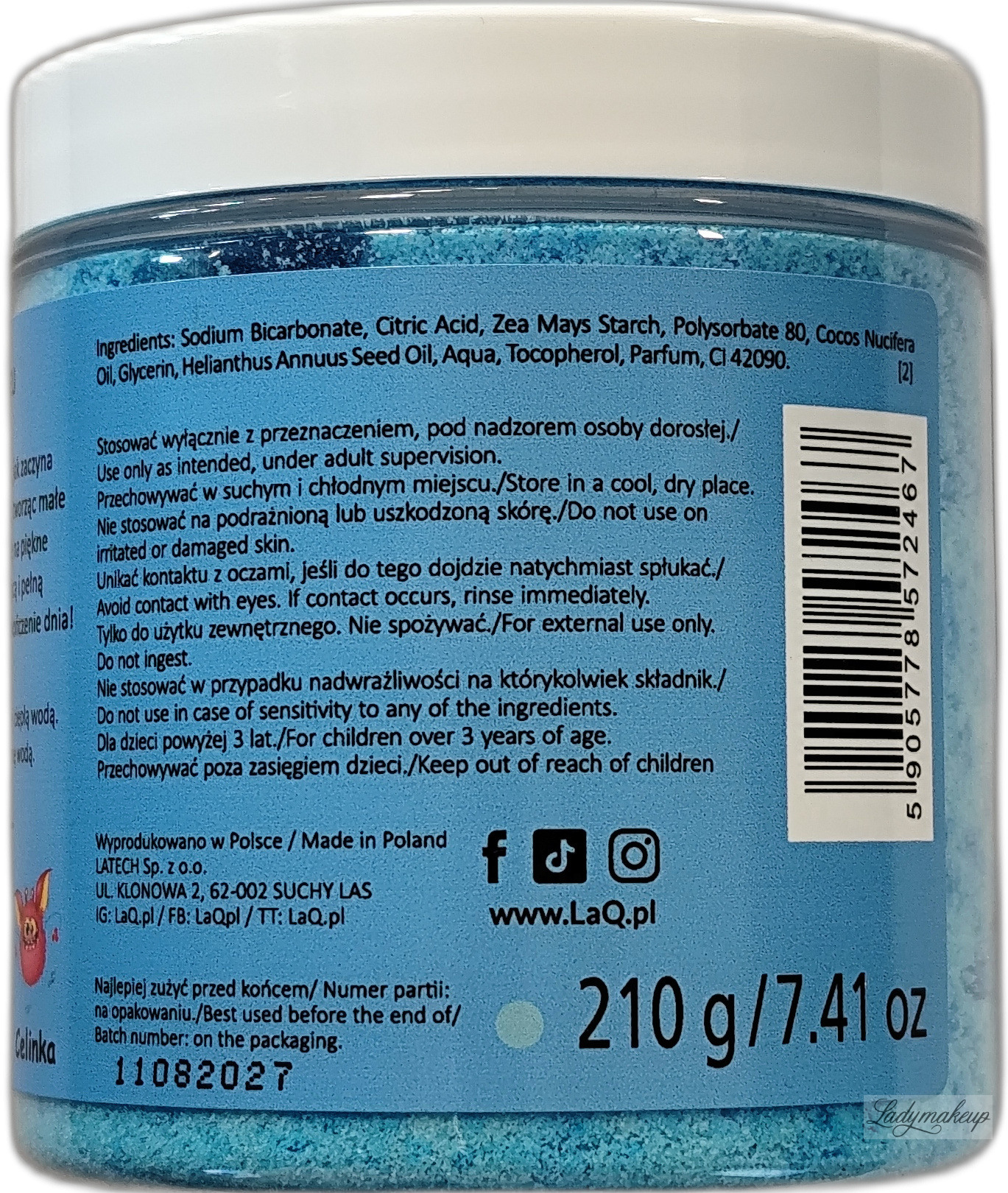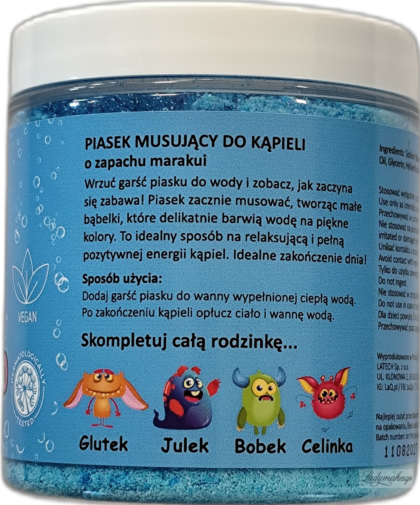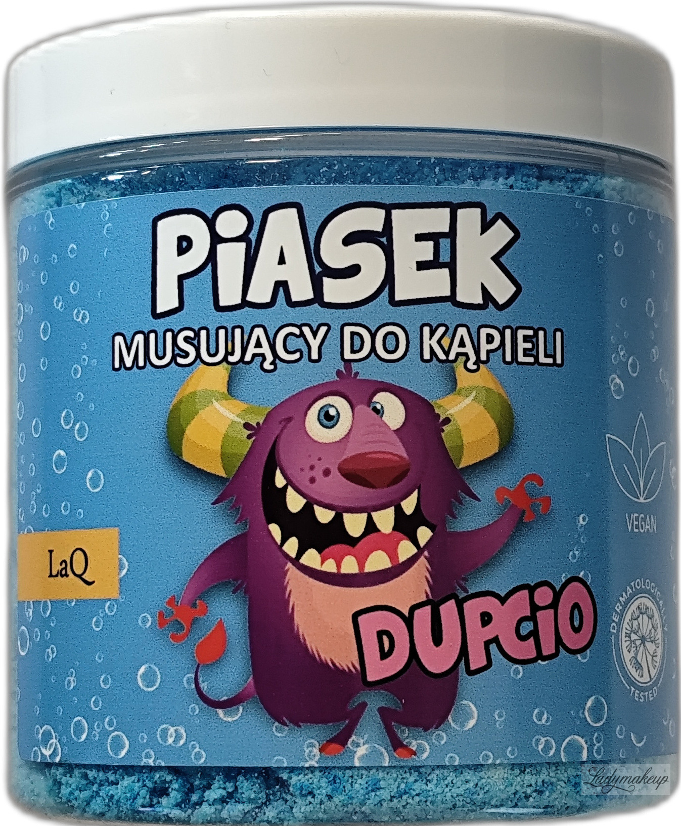 is 100% vegan. It's perfect for children, teenagers, and adults alike! It effectively transforms every bathroom visit into an incredible journey of fun. LaQ sand has a delicate, loose formula that fizzes enticingly when added to water, creating playful bubbles on the surface. It dissolves easily and tints the water a vibrant purple. Even a small amount will make anyone, even those who aren't bath enthusiasts, eager to immerse themselves in this colorful pool. The product is enriched with active ingredients such as coconut oil, glycerin, and vitamin E, which actively nourish, moisturize, and smooth the skin. LaQ Dupcio sand features grapefruit in the top notes, passionfruit and strawberry in the middle notes, and vanilla in the base notes. The product is available in a 190g container.