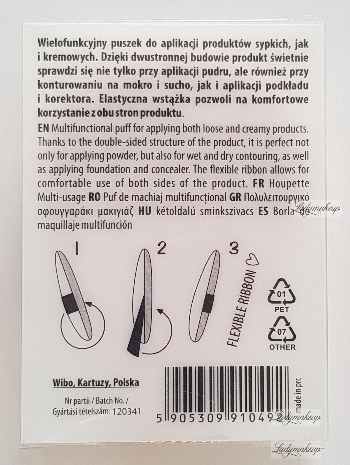 A powder puff. Perfect for applying both loose and cream cosmetics. Its innovative, double-sided structure makes it incredibly versatile. The yellow side is a soft and flexible sponge, perfect for applying and blending liquid and cream products like foundation, concealer, and blush. The other, pink side is a fluffy, soft puff for applying powder. Instead of a traditional ribbon, it features a special elastic band that can be easily switched between sides. The large surface area ensures quick application of cosmetics. The package contains one puff.