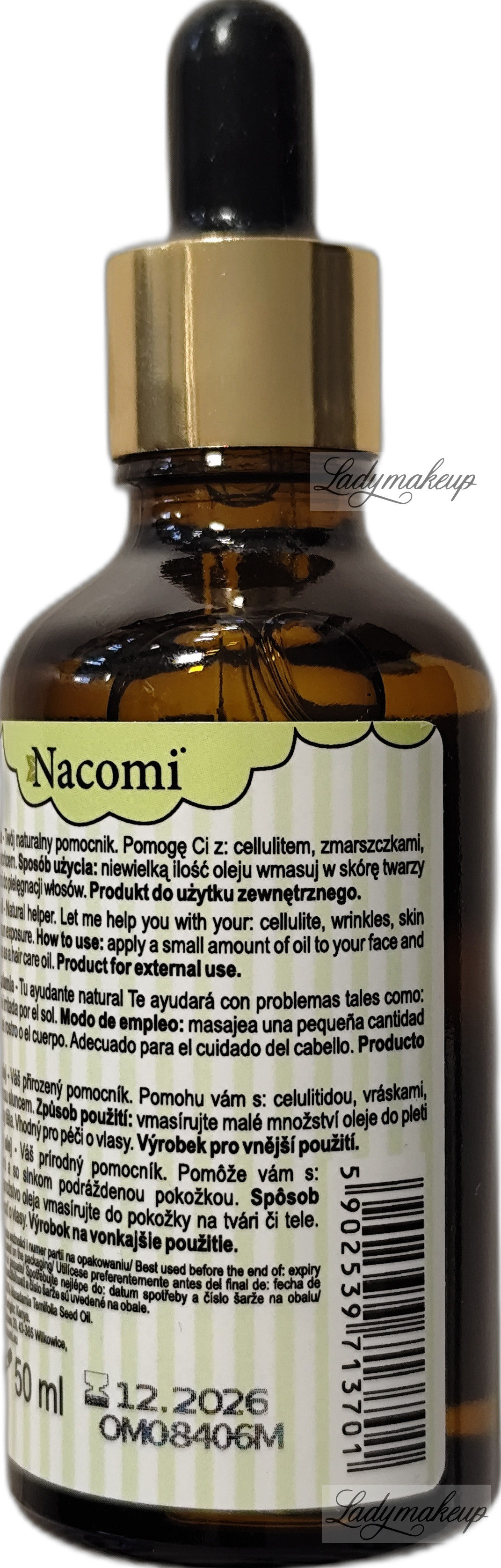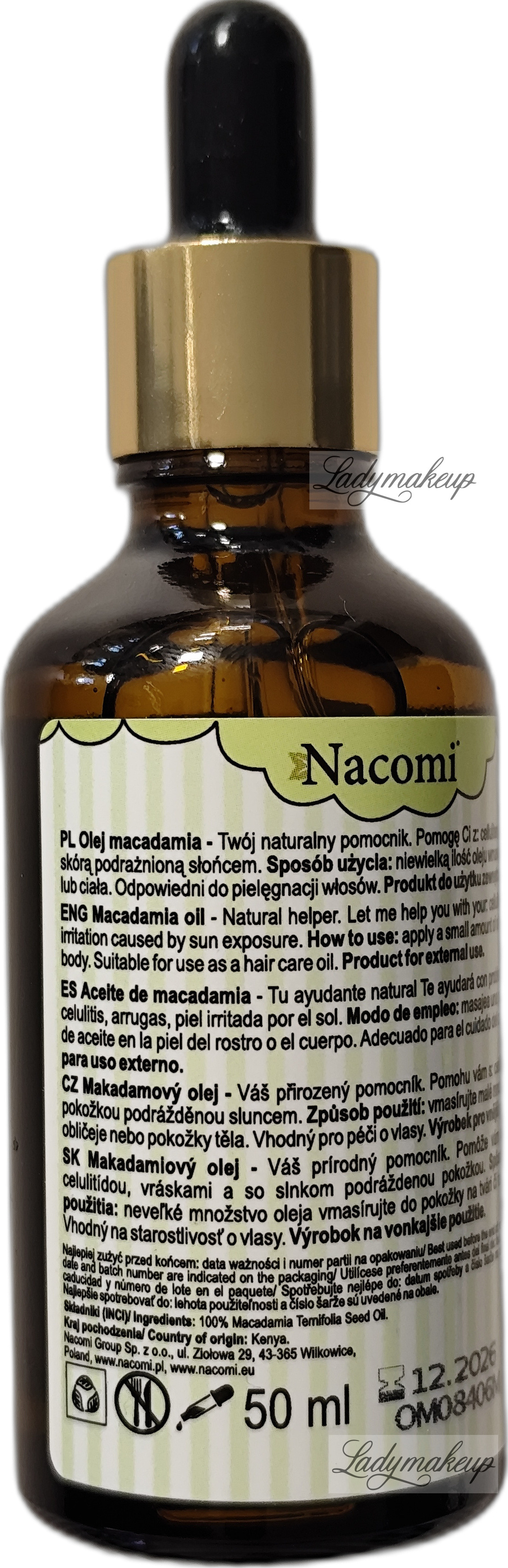 Macadamia oil. It is intended among others for dry, flabby and struggling with cellulite skin. It has a 100% natural formula, rich in vitamins B1, B2, B3 and E as well as minerals. Regularly used, it restores skin smoothness and firmness. It helps to get rid of cellulite, orange skin and soothes irritation after tanning (while fixing the tan). In addition, it eliminates stretch marks, pimples, scars and discoloration. It can be used by adults and children on the body, hair, face and hands.
