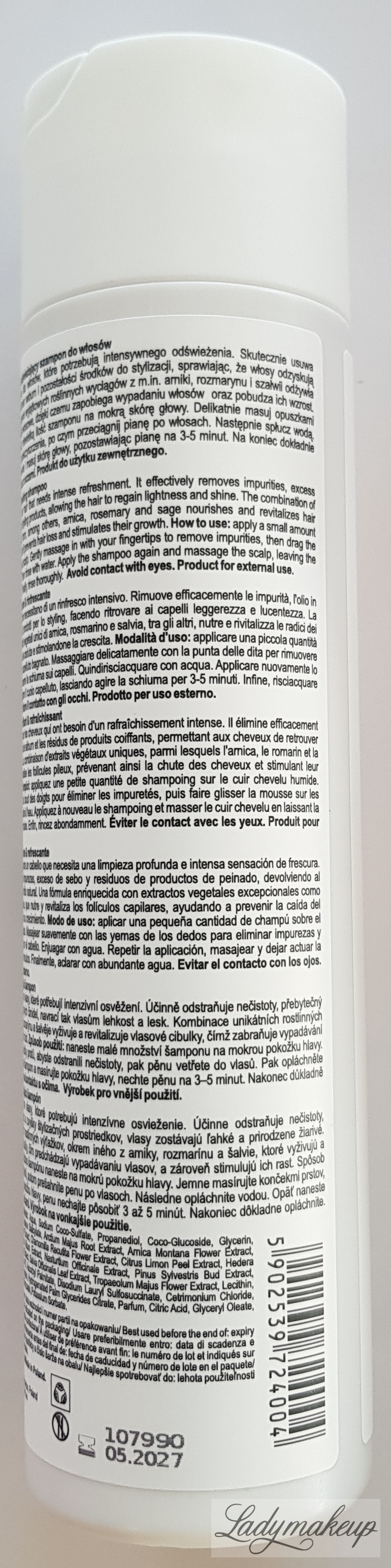 A hair shampoo. Created specifically for oily scalps and all hair types, it effectively removes impurities, cosmetic residue, and excess sebum, leaving hair strands long-lastingly refreshed and cleansed. It effectively combines carefully selected active ingredients, including arnica, pine, rosemary, and sage extracts, betaine, and salicylic acid. The product gently exfoliates, stimulates skin microcirculation, regulates sebum overproduction, and nourishes and regenerates. It also effectively prevents hair loss and stimulates healthy growth. After use, hair is flexible, full of healthy shine, strengthened, and resistant to damage. Nacomi hair shampoo is available in a 250 ml bottle.