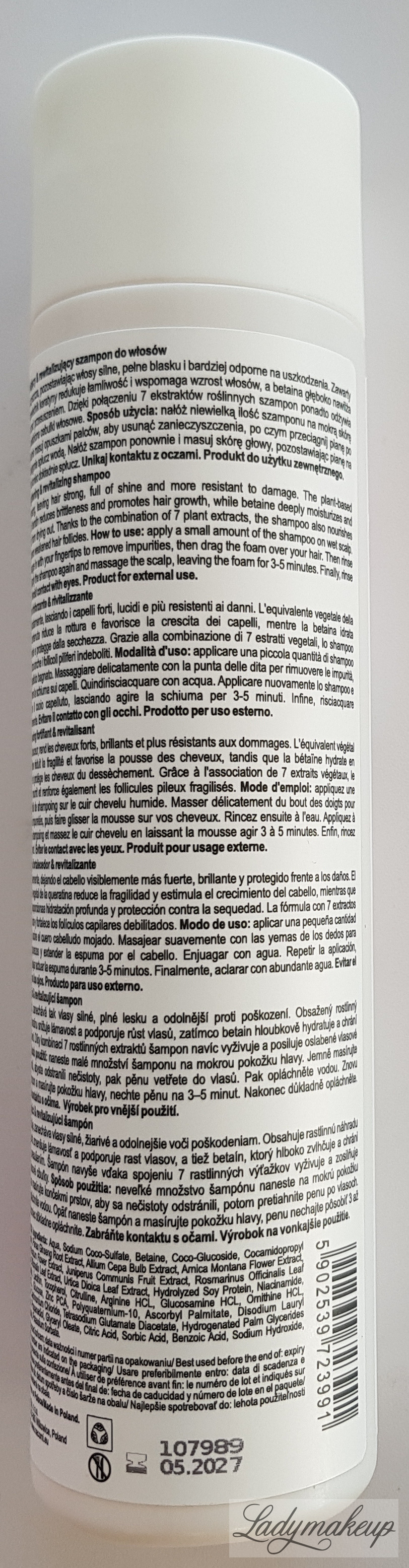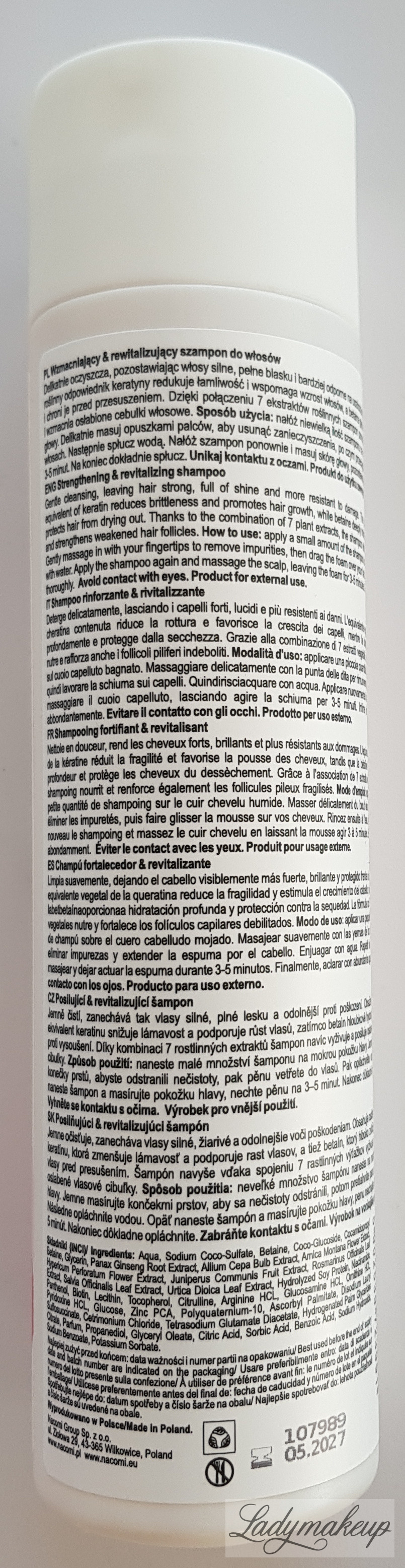 A hair shampoo specifically designed for the care of weakened, brittle, and volume-deprived hair. It effectively combines natural extracts with a plant-based keratin equivalent, including soy protein, ginseng extract, zinc, amino acids, and B vitamins. This lightweight formula gently cleanses and purifies hair. It also actively strengthens hair, restoring its healthy appearance and resistance to damage, while also improving elasticity, shine, revitalization, nourishment, and hydration. Furthermore, Nacomi shampoo hydrates, smooths, and reduces frizz, while also softening and improving elasticity. Available in a 250 ml bottle.