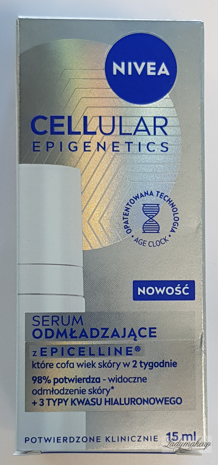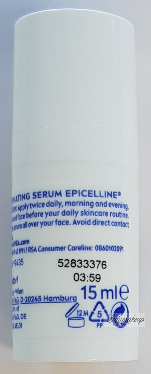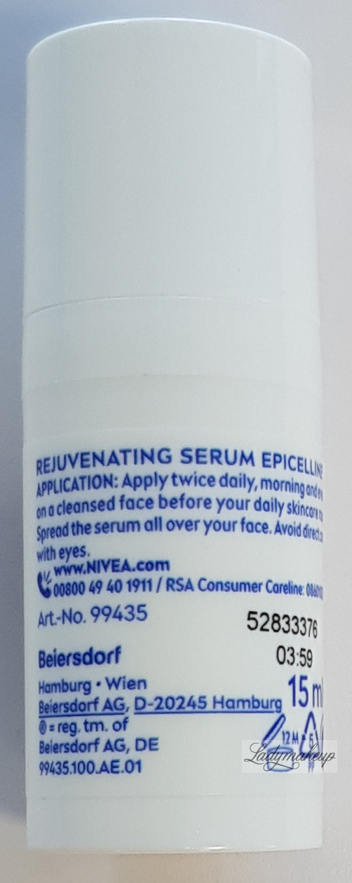 A facial serum. Designed for daily morning and evening care for mature skin with visible wrinkles. Its pleasantly creamy formula is enriched with the groundbreaking, rejuvenating ingredient Epicelline® and three forms of hyaluronic acid. Regular use of this Nivea serum effectively reverses up to 10 signs of skin aging, making the skin visibly firmer, and more elastic. It also reduces the appearance of fine lines and wrinkles, intensely moisturizes and hydrates, and smooths and softens the epidermis. Furthermore, the Nivea serum leaves the complexion looking radiant and youthful, giving it a healthy glow. Available in a 15 ml bottle.
