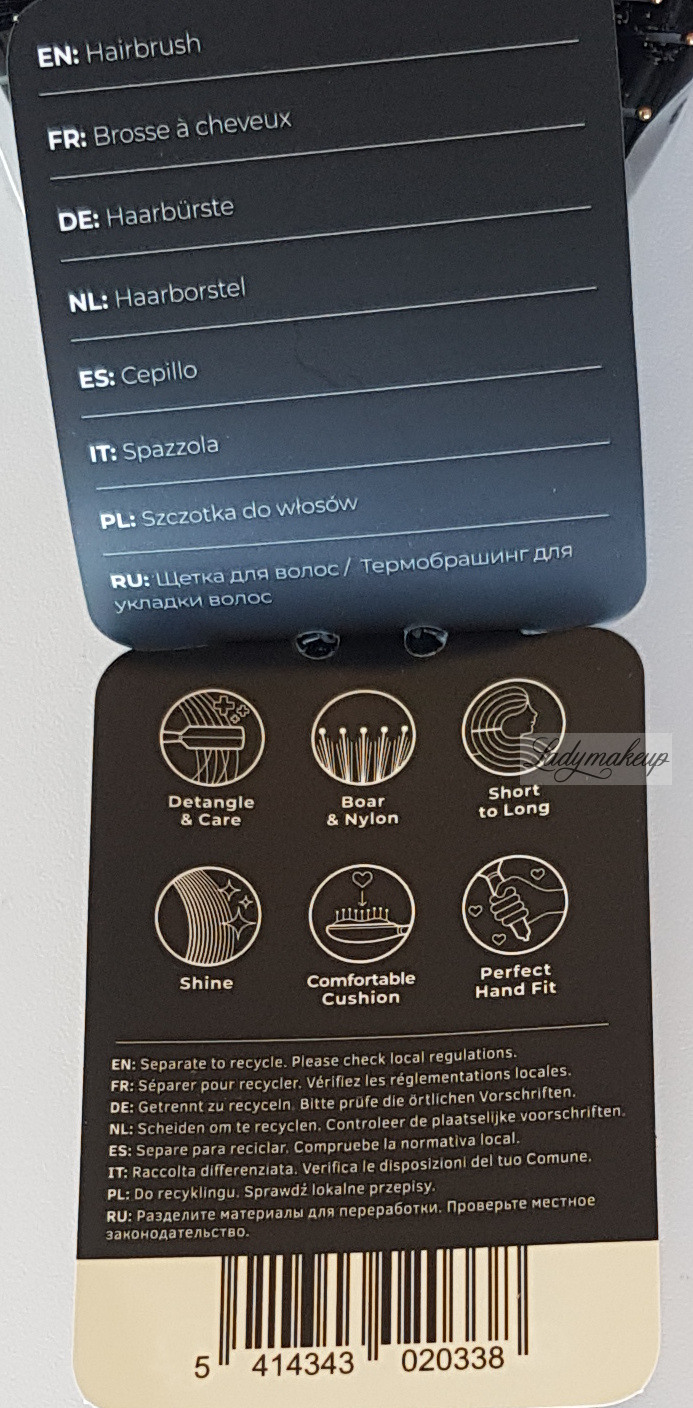 The Olivia Garden hairbrush is designed for hair of various lengths, from short to long. It features an oval shape with a soft cushion that cushions the scalp. It detangles effectively without painful pulling or tugging. It features special flexible nylon needles tipped with gold beads that gently massage the scalp while brushing, stimulating microcirculation and hair growth. Additionally, the Olivia Garden brush features 100% natural boar bristles that smooth and add shine to hair. The convenient handle fits comfortably and securely in the hand. The brush is available in an elegant black shade.