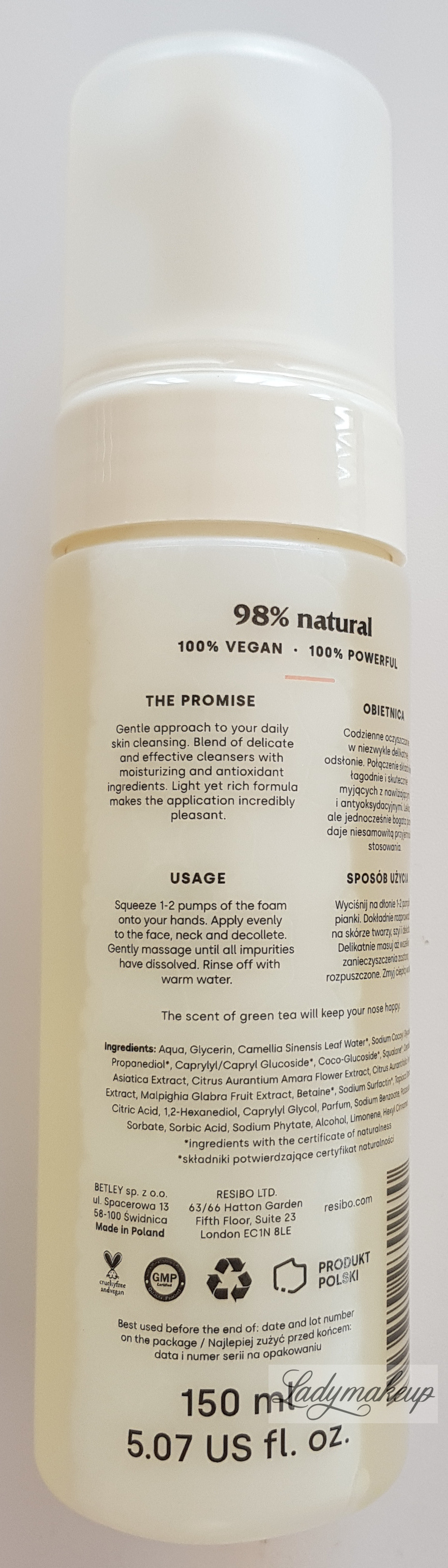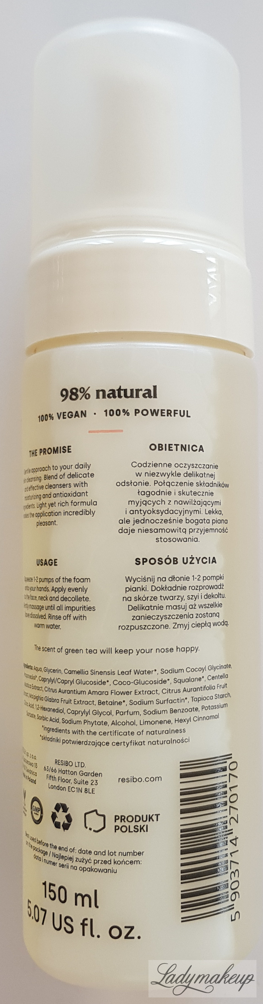 This facial foam has a pleasantly creamy and velvety formula that gently cleanses the skin and removes impurities, sebum, and cosmetic residue. It is enriched with specially selected active ingredients, including centella asiatica extract, which soothes and calms irritations, and has anti-inflammatory and antibacterial properties. Additionally, Resibo foam noticeably firms, tightens, and tones the epidermis. It also strengthens and tones blood vessels. Resibo foam is available in a 150 ml bottle.
