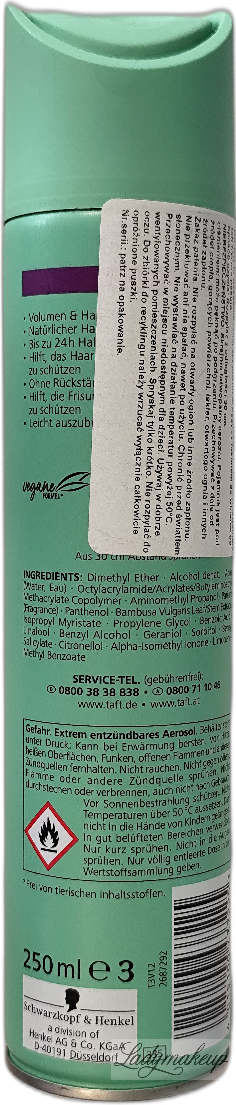 Taft hairspray is 100% vegan. It was created specifically for all hair types. It effectively adds volume to strands and also lifts them at the roots. It provides excellent hold at level 3, which will effectively maintain your chosen style for up to 24 hours after application. Its formula contains, among other things, a collagen complex with bamboo extract, which actively nourishes strands and protects them from the harmful effects of external factors and UV rays. Taft Volumen hairspray makes styling any hair type incredibly quick, simple, and enjoyable. Furthermore, it doesn't stick strands together or weigh them down, and is very easy to brush out. Taft hairspray is available in a 250 ml bottle.