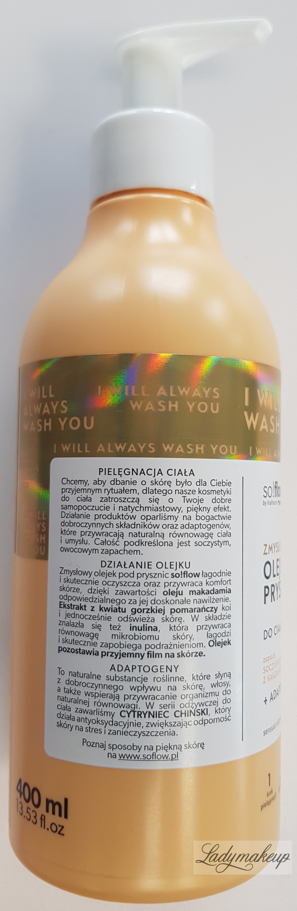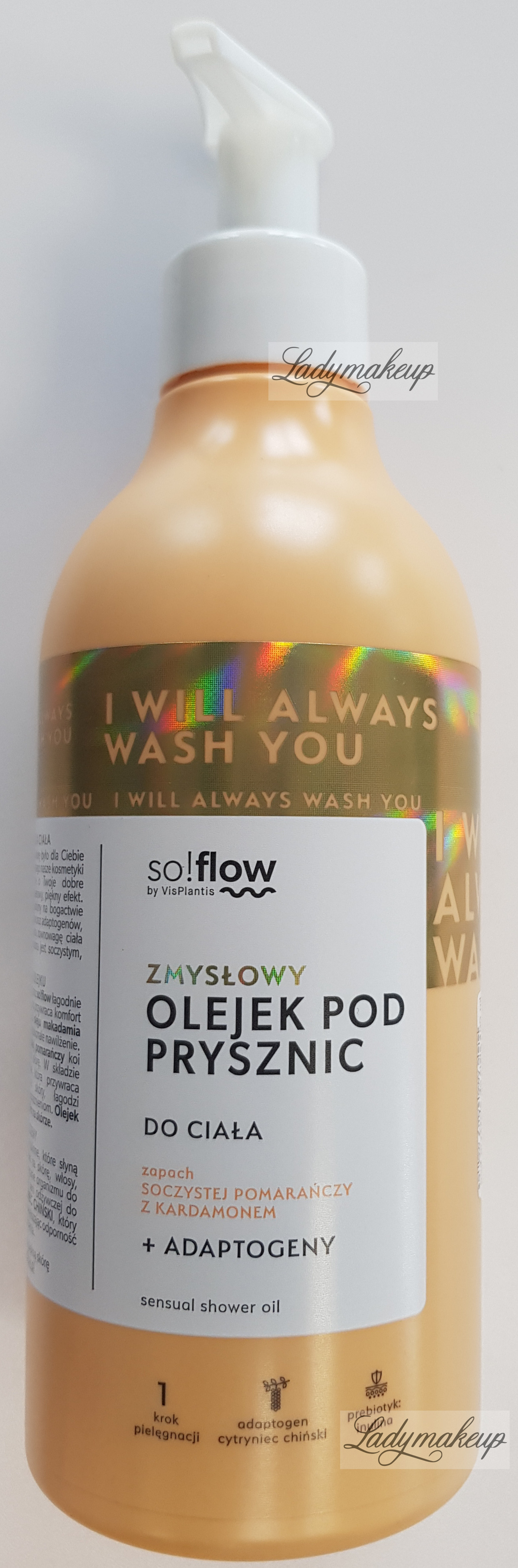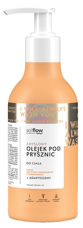 A body oil. It can be used in the shower or bath. It thoroughly cleanses and purifies the skin of all impurities and dirt without drying it out. Enriched with specially selected active ingredients such as macadamia oil, bitter orange blossom extract, and inulin. So!Flow oil intensely moisturizes, deeply nourishes, soothes and calms irritations, refreshes the epidermis, and restores the skin's microbiome balance. Additionally, So!Flow oil effectively combats dry and flaky skin and adds a healthy glow to the skin. The product also has a tempting orange and cardamom scent. It is available in a 400 ml bottle.