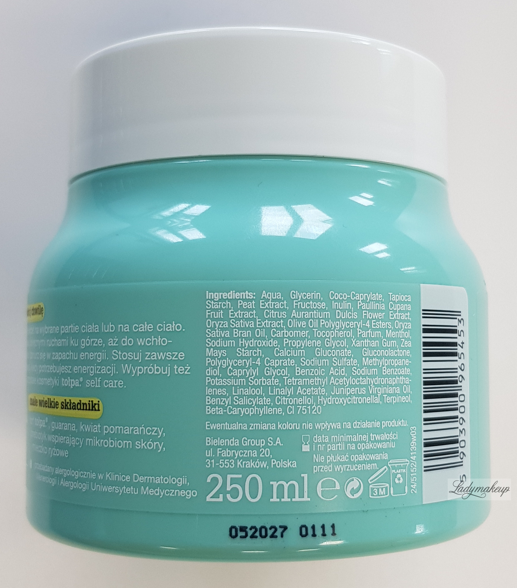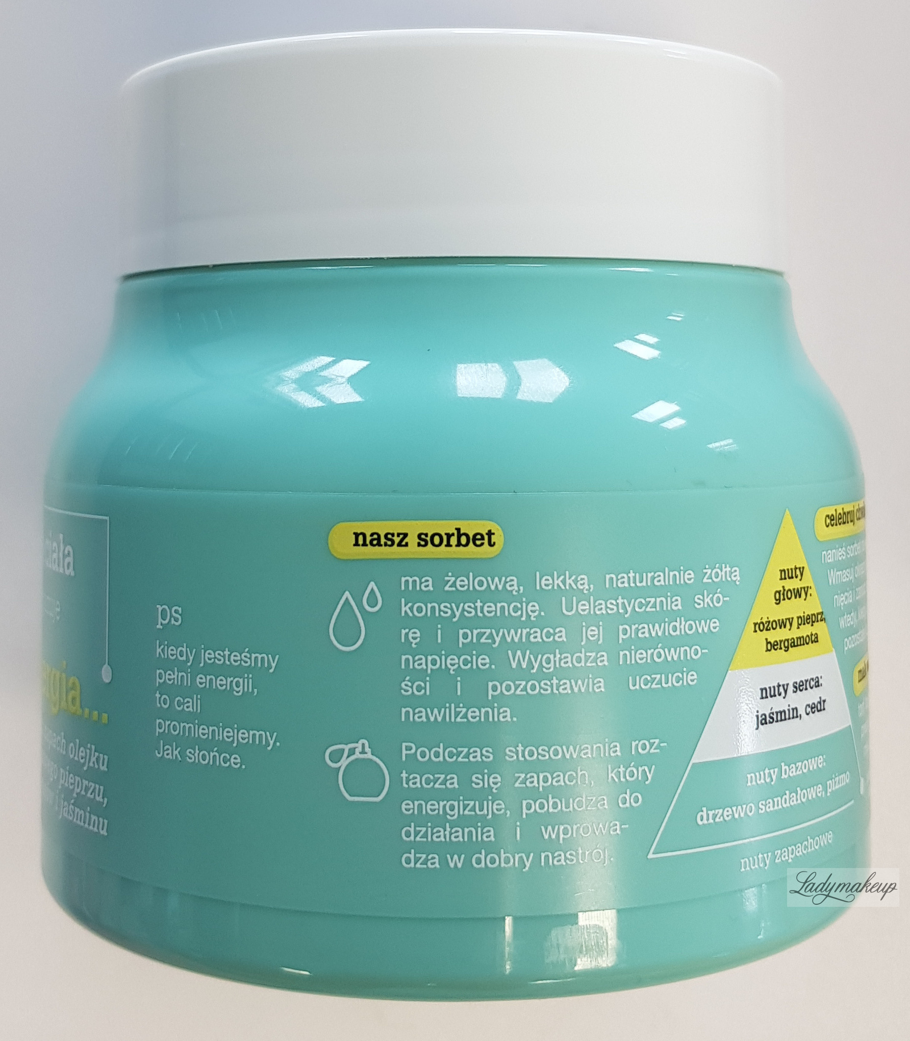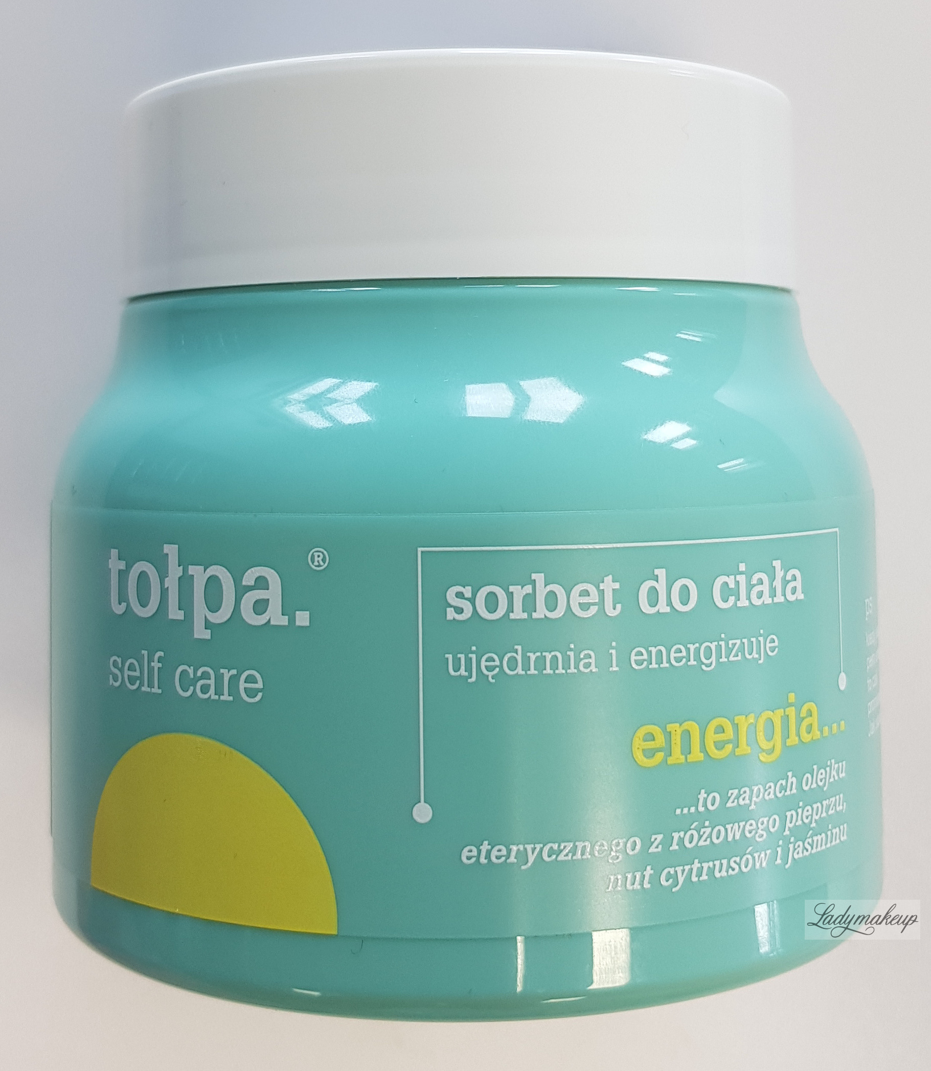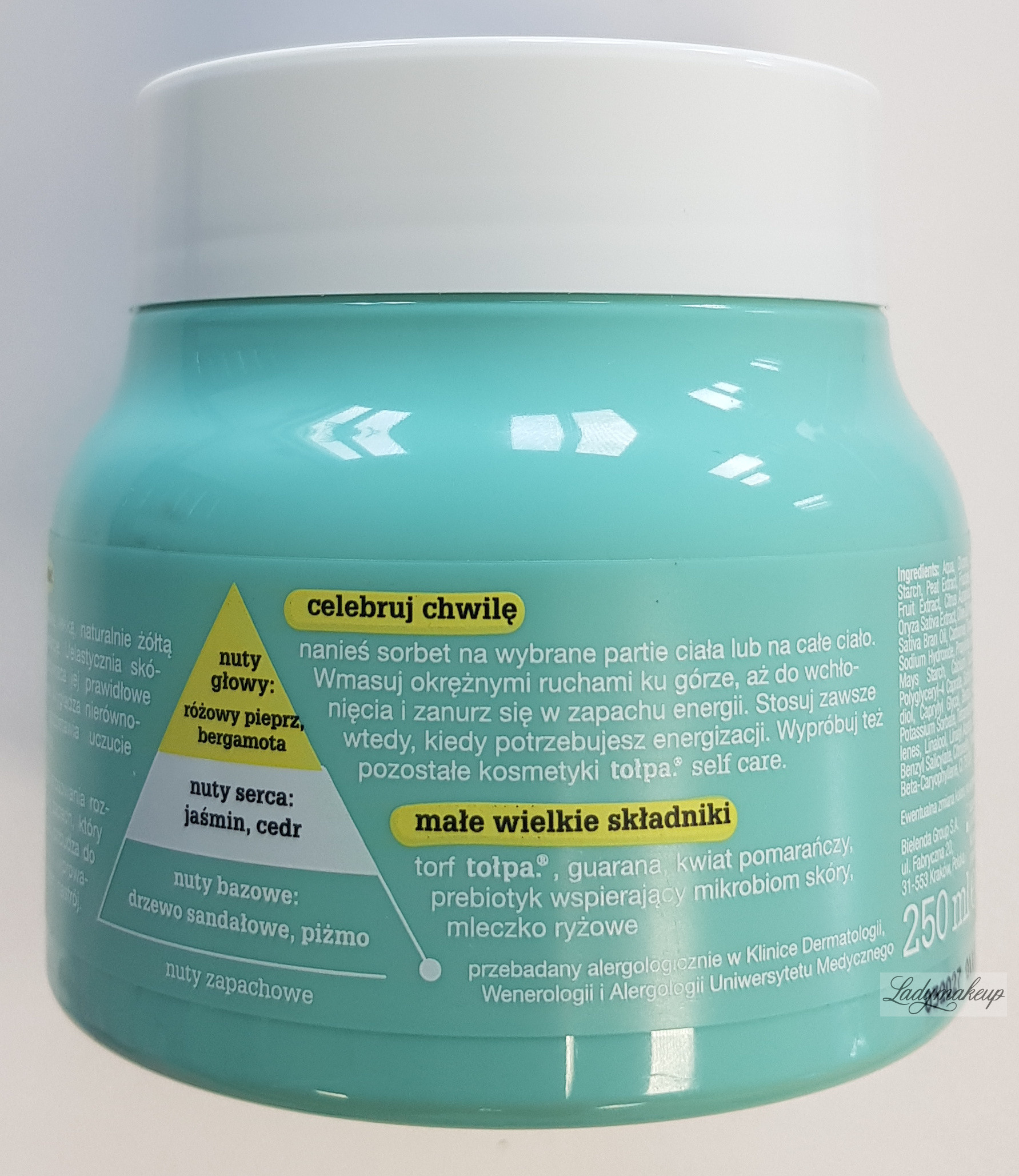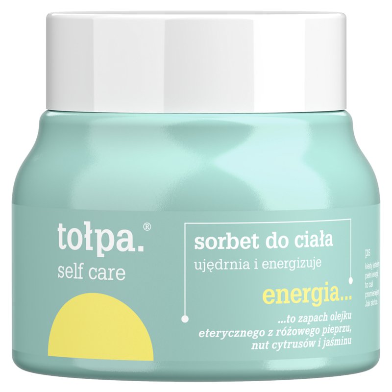 comes from the special Self Care series. It has a pleasantly light, gel-like consistency with a natural yellow color that is pleasant to apply, blends easily, and absorbs quickly into the skin. It contains specially selected active ingredients such as Tołpa peat, guarana, orange blossom, prebiotic, and rice milk. Tołpa Sorbet moisturizes the skin, smooths unevenness, and also improves elasticity, firmness, and energy. Simply apply a small amount to selected areas or the entire body and massage in to enjoy comfort and professional care. Furthermore, Tołpa Sorbet energizes the skin, stimulates activity, and puts you in a good mood. Top notes include pink pepper and bergamot, middle notes include jasmine and cedar, and base notes are sandalwood and musk. The product is available in a 250 ml bottle.