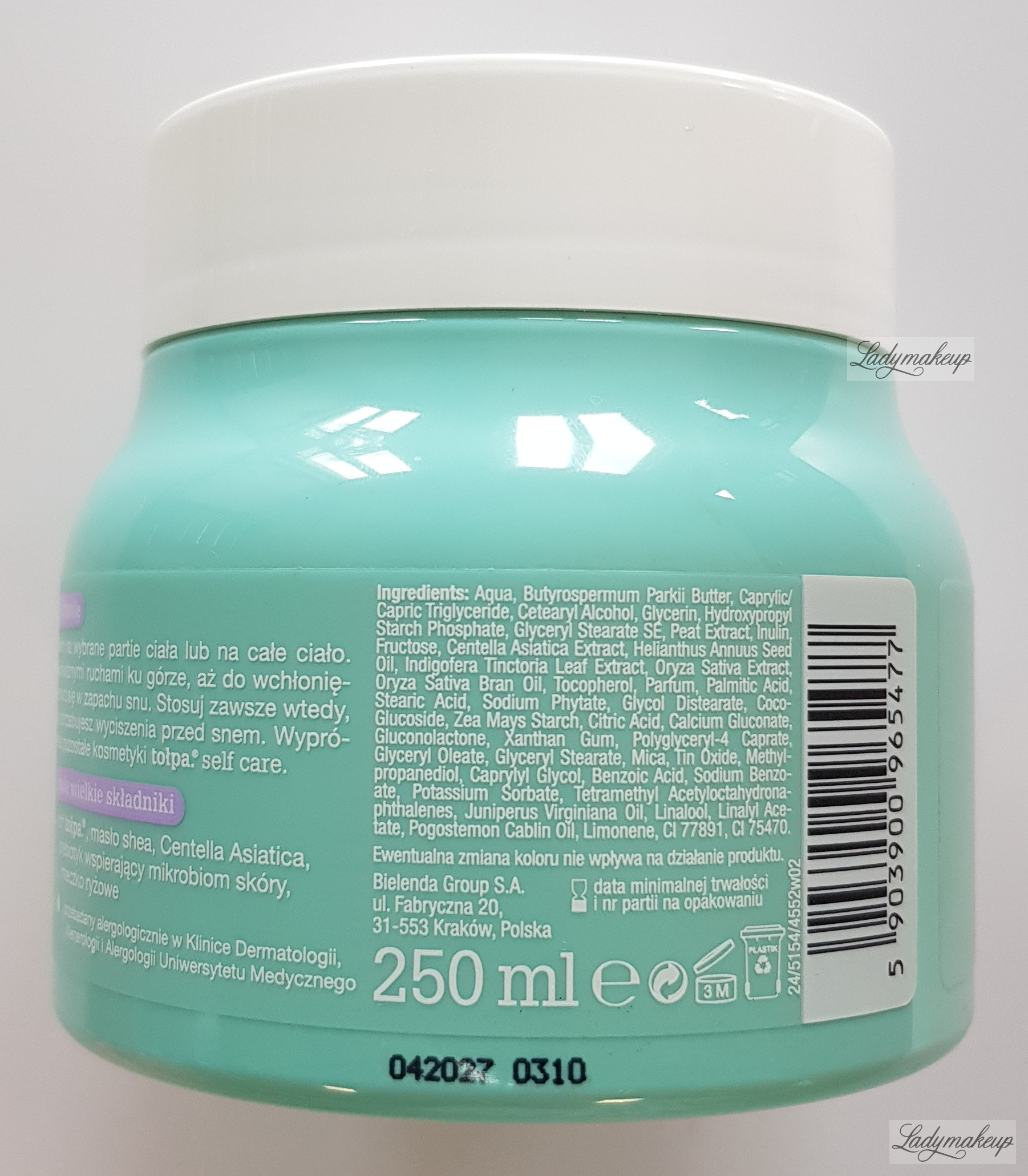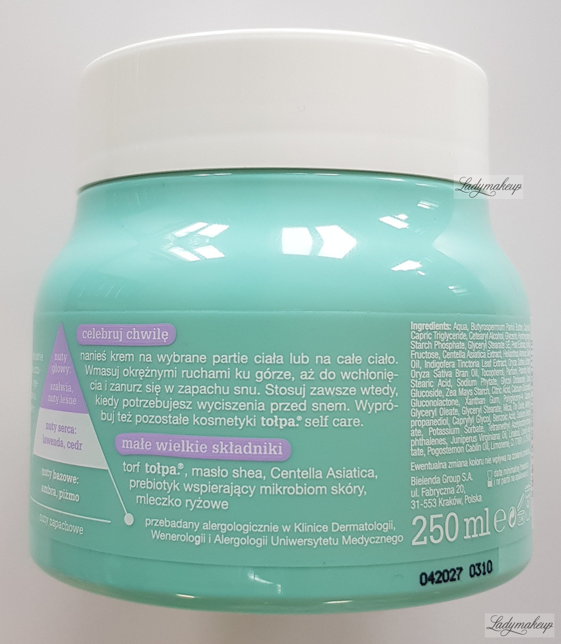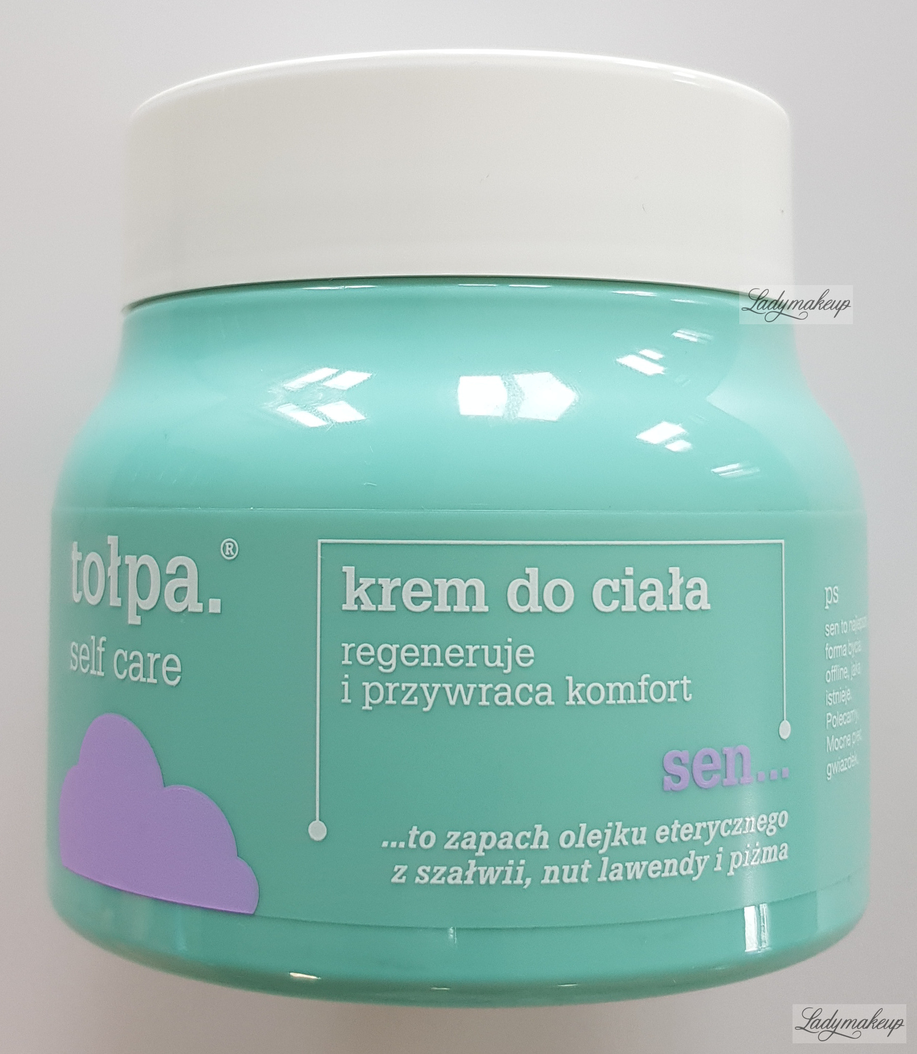 comes from the special Self Care series. Its pleasantly creamy formula with a natural purple tint is pleasant to apply, blends easily, and absorbs quickly into the skin. It contains specially selected active ingredients such as Tołpa peat, shea butter, centella asiatica, prebiotic, and rice milk. Tołpa Cream deeply and intensely moisturizes, nourishes, and stimulates skin to regenerate and rebuild itself much faster. At the same time, Tołpa Cream soothes irritations, protects against dryness, and restores skin's feeling of comfort. It's best to apply the cream just before bed, as its aroma (top notes: sage and forest scents, middle notes: lavender and cedar, base notes: amber and musk) positively influences its quality. The product is available in a 250 ml bottle.