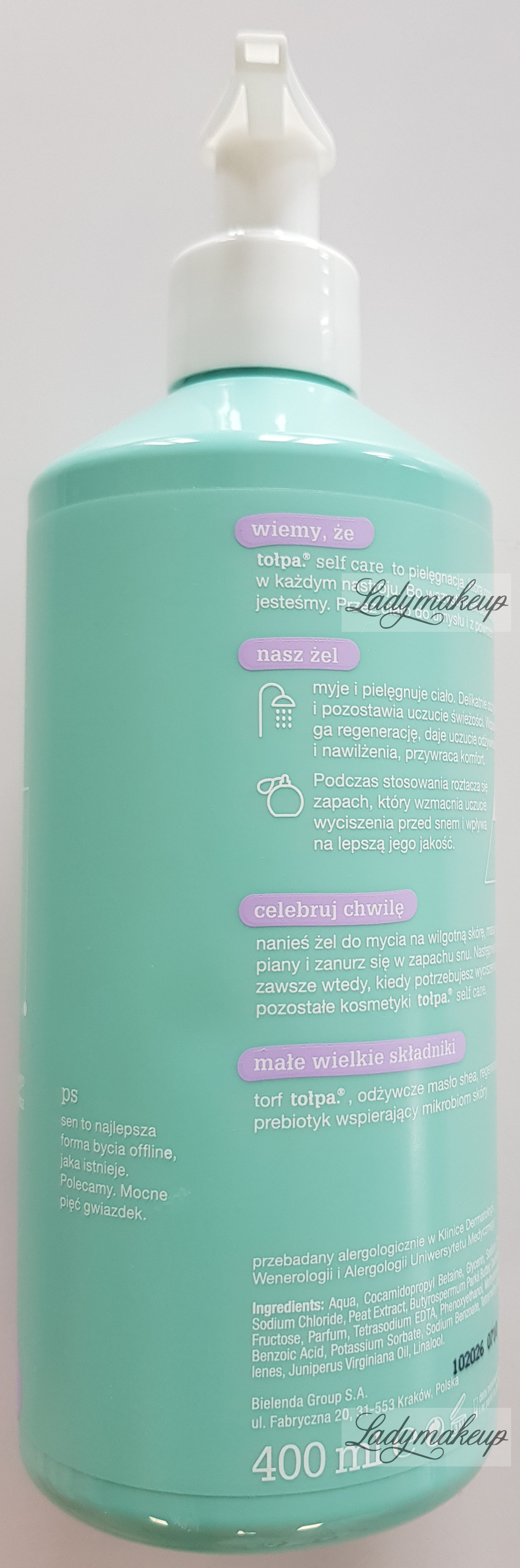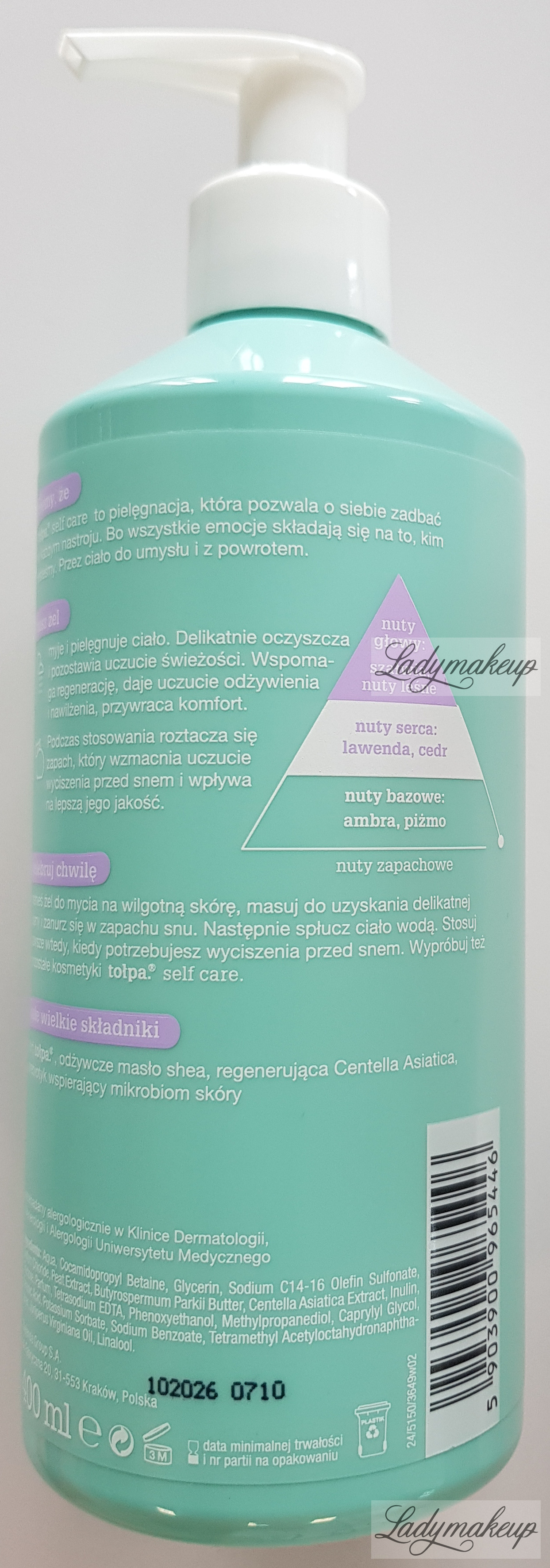 comes from the special Self Care series, designed to care for both body and mind. Its action is based on specially selected active ingredients such as Tołpa peat, shea butter, centella asiatica, and a prebiotic, which actively nourish the skin throughout the body. Tołpa Gel thoroughly cleanses and removes all impurities without damaging its natural protective barrier. It effectively moisturizes and deeply nourishes the epidermis, strengthens and stimulates skin regeneration. It has a pleasant fragrance (top notes: sage and a forest scent, middle notes: lavender and cedar, base notes: amber and musk) that relaxes and calms, making Tołpa Gel ideal for evening use. The product is available in a 400 ml bottle.