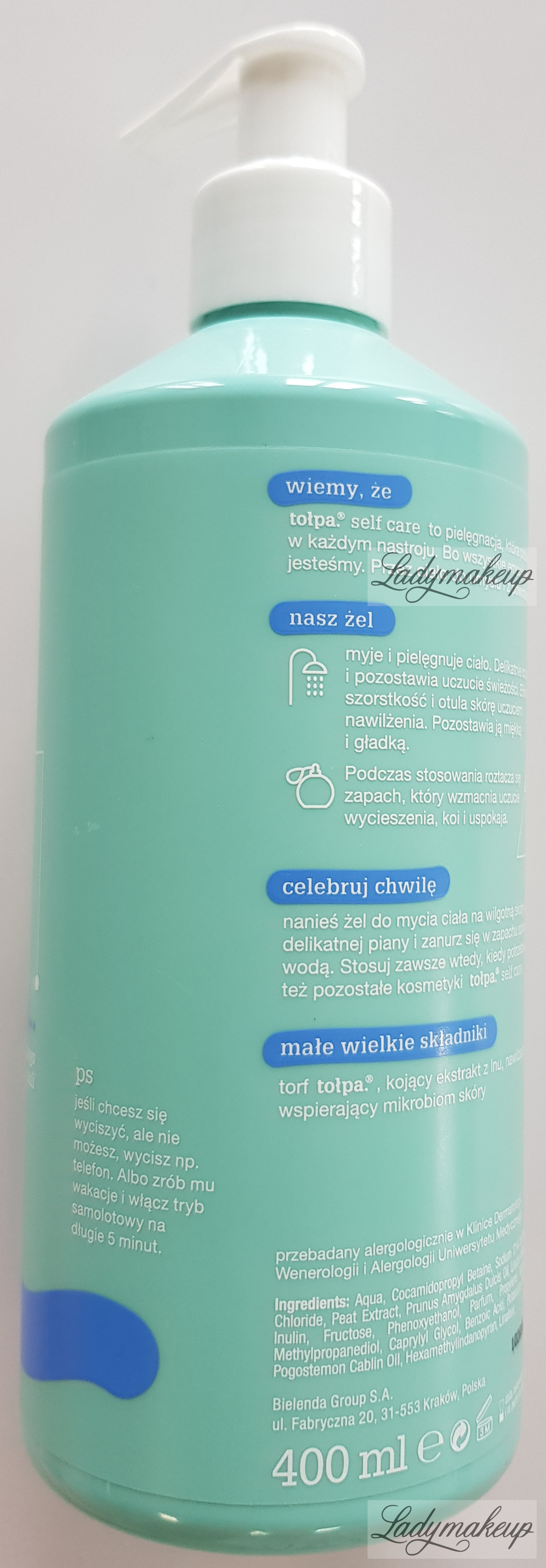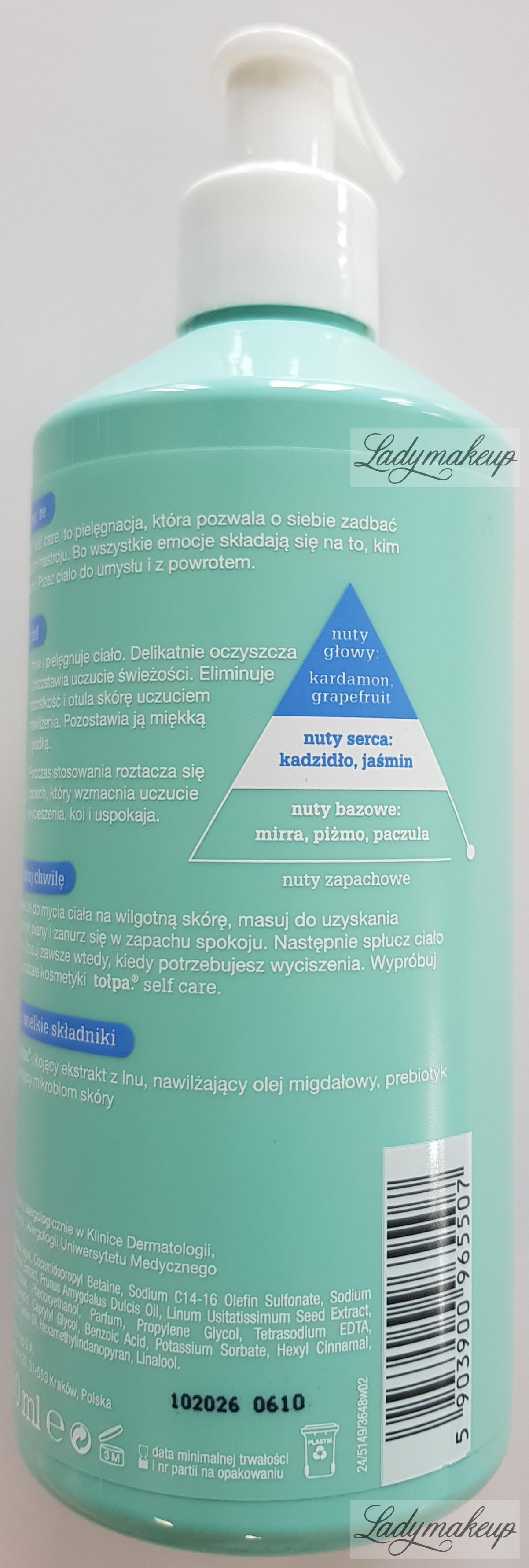 comes from the special Self Care series, designed to care for both body and mind. Its action is based on carefully selected active ingredients, including Tołpa peat, flax extract, almond oil, and a prebiotic. Tołpa Gel thoroughly cleanses and purifies the skin, removing all impurities without damaging its natural protective barrier. It also intensely moisturizes and deeply nourishes the epidermis, softening and smoothing the skin. It has a pleasant fragrance (top notes: cardamom and grapefruit, heart notes: frankincense and jasmine, base notes: myrrh, musk, and patchouli) that relaxes and soothes the mind and body. The product is available in a 400 ml bottle.