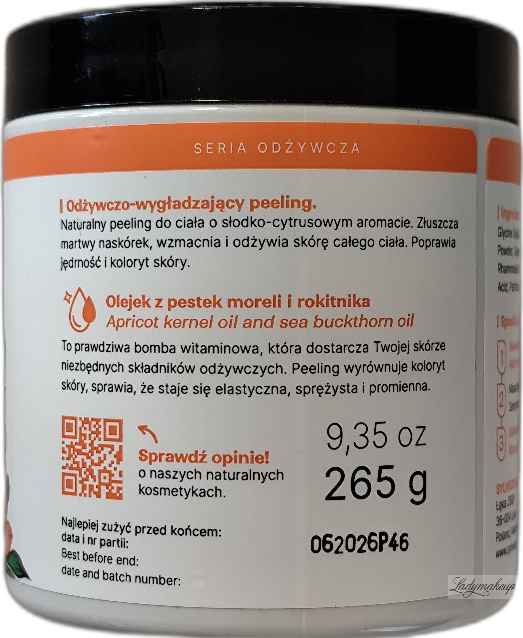 It comes from a special orange series, containing products with a strongly nourishing formula. It consists of finely ground apricot kernels and sugar, thanks to which it exfoliates dead skin, thoroughly cleanses, moisturizes and smoothes the skin. Additionally, apricot kernel oil and sea buckthorn oil provide vitamins and antioxidants, making the skin regain a healthy color and elasticity. The product contains ingredients of natural origin and herbs from organic farming.