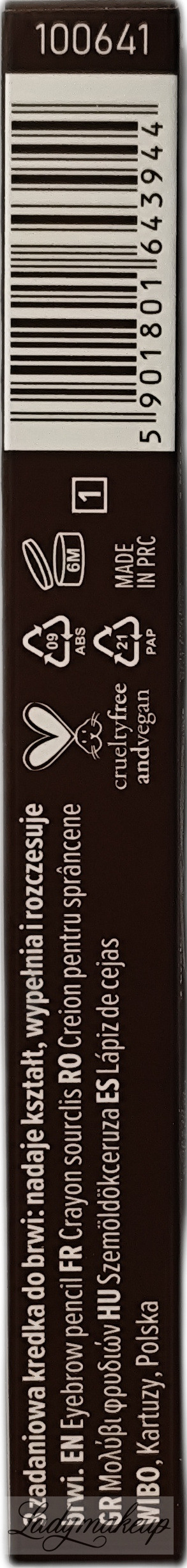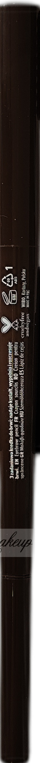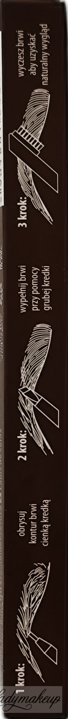 Eyebrow pencil. It allows you to achieve a spectacular, fashionable and tempting effect in just a few minutes! It combines as many as 3 products in one cosmetic! It is equipped with two tips. On one side, an oblique, triangular tip has been placed, which will allow you to perfectly define the shape of the eyebrows. The closure that protects this part has been equipped with a handy synthetic comb that will brush excess product from the eyebrows and style them beautifully. On the other side, a thin tip has been placed, allowing for precise drawing of individual hairs and filling in empty spaces. achieves a very natural-looking finish. The innovative formula ensures that the product does not smudge and stays on the skin for a long time.