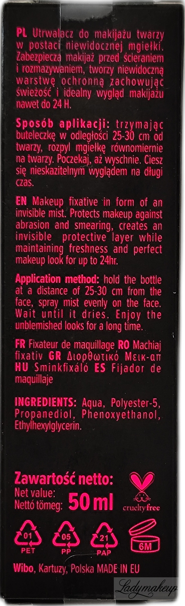 Make-up fixer. It was placed in a convenient matte-black bottle with an atomizer. It has a light formula that regulates the excess of secreted sebum and reduces shine of the skin, without fear of damaging the makeup. Professionally protects make-up against abrasion and smudging for long hours. It makes the complexion beautifully refreshed, while the makeup looks perfect in any situation and weather conditions, as well as any other situation. The cosmetic is available in a capacity of 50 ml.